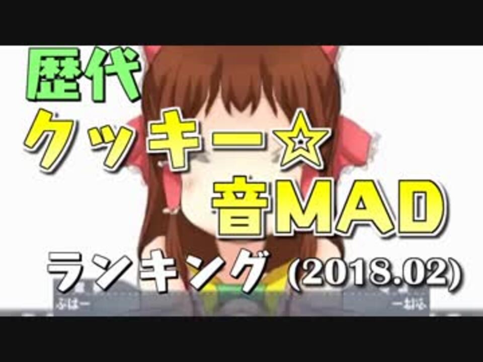 クッキー☆8周年記念☆<br>プレイリスト(1~100位+特集): <a href="https://www.nicovideo.jp/mylist/73710138" target="_blank" rel="noopener">mylist/73710138</a><br><br><a href="#" class="seekTime" data-seekTime="00:26" onclick="seekNicoPlayer('#00:26'); return false;">#00:26</a> 50位-31位<br><a href="#" class="seekTime" data-seekTime="08:50" onclick="seekNicoPlayer('#08:50'); return false;">#08:50</a> 特集1:削除された音MAD<br><a href="#" class="seekTime" data-seekTime="10:35" onclick="seekNicoPlayer('#10:35'); return false;">#10:35</a> 30位-11位<br><a href="#" class="seekTime" data-seekTime="19:00" onclick="seekNicoPlayer('#19:00'); return false;">#19:00</a> 特集2:集計漏れ動画<br><a href="#" class="seekTime" data-seekTime="21:10" onclick="seekNicoPlayer('#21:10'); return false;">#21:10</a> 10位-4位<br><a href="#" class="seekTime" data-seekTime="24:38" onclick="seekNicoPlayer('#24:38'); return false;">#24:38</a> 3位-1位<br><br>先駆者兄貴(2015年5月時点のランキング):<a href="https://www.nicovideo.jp/watch/sm26217142" class="watch">sm26217142</a>