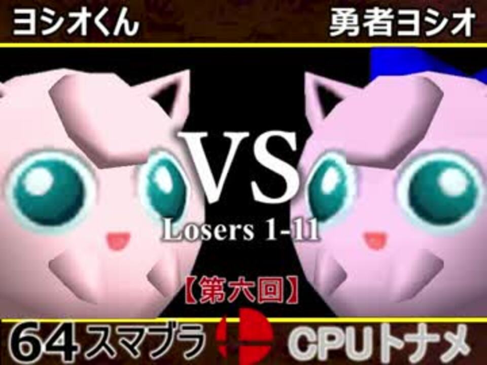 ヨシオ族の戯れ<br /><u>※どちらが勝つかアンケ結果(Twitter調べ)</u><br />ヨシオくん(PU) 54% VS 勇者ヨシオ(PU) 46%<br /><br />【大会形式】ダブルイリミネーション方式トーナメント<br />・一度負けてもルーザーズ側を勝ち続ければ決勝に行ける<br /><br /><font color="#0000ff"><u>※64スマブラCPUトナメ実況のwikiができた模様</u>→</font> <a href="https://wiki3.jp/cpu_64" target="_blank" rel="noopener nofollow">https://wiki3.jp/cpu_64</a><br /><br /><b><font size="5"><font color="#ff0000">次→</font></font></b>【<a href="https://www.nicovideo.jp/watch/sm32762708" class="watch">sm32762708</a>】<br /><br />前【<a href="https://www.nicovideo.jp/watch/sm32751148" class="watch">sm32751148</a>】 一回戦第一試合【<a href="https://www.nicovideo.jp/watch/sm32538745" class="watch">sm32538745</a>】<br /><br />第六回マイリスト【<a href="https://www.nicovideo.jp/mylist/60846974" target="_blank" rel="noopener">mylist/60846974</a>】<br />64スマブラCPUトナメ実況part1まとめ【<a href="https://www.nicovideo.jp/mylist/60846861" target="_blank" rel="noopener">mylist/60846861</a>】<br />その他シリーズ【<a href="https://www.nicovideo.jp/mylist/12965027" target="_blank" rel="noopener">mylist/12965027</a>】<br /><br /><b><font color="#00bfff">Twitter</font></b>【@niconicopppppp】<br /><b><font color="#ff4500">チャンネル</font></b>【<a href="https://ch.nicovideo.jp/p-desu" target="_blank" rel="noopener">ch.nicovideo.jp/p-desu</a>】