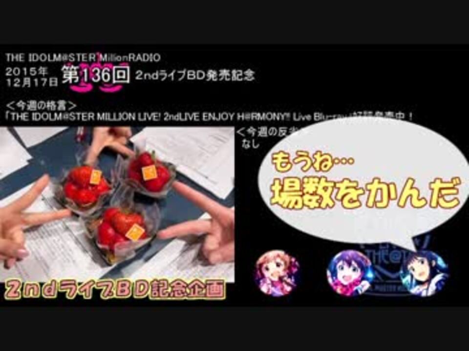 ニコ生にてミリオン2ndライブの模様と生コメンタリーが配信されましたね。<br />今回はそんな2ndライブのブルーレイが発売された翌日のミリラジ第136回の単発まとめです。発売記念企画としてライブについて色々語ったり脱線したりと、まぁいつも通りです。<br /><br />もしよろしければこちらもどうぞ<br />【ミリラジ単発まとめ】(~2015)<br />・第0回 すんごいパイロット回→ <a href="https://www.nicovideo.jp/watch/sm32152775" class="watch">sm32152775</a><br />・第117/118回 DJと曲紹介と…→ <a href="https://www.nicovideo.jp/watch/sm32399637" class="watch">sm32399637</a><br />・第119/120回 感想文とC&c→ <a href="https://www.nicovideo.jp/watch/sm32388746" class="watch">sm32388746</a><br />・第121/122回 うそと説明力→ <a href="https://www.nicovideo.jp/watch/sm32502760" class="watch">sm32502760</a><br />・第125/126回 おこもちょと本→ <a href="https://www.nicovideo.jp/watch/sm32618276" class="watch">sm32618276</a><br />・第127/128回 腕相撲ともちょろい→ <a href="https://www.nicovideo.jp/watch/sm32789631" class="watch">sm32789631</a><br />・第129回 ハロウィン回@ぴらみさん→ <a href="https://www.nicovideo.jp/watch/sm32278696" class="watch">sm32278696</a><br />・第132/133/134回 のむらとお風呂と漢字→ <a href="https://www.nicovideo.jp/watch/sm32658666" class="watch">sm32658666</a><br />・第135回 色々やんばい回@べーせん→ <a href="https://www.nicovideo.jp/watch/sm32287856" class="watch">sm32287856</a><br />・第137回 萌えクリスマス→ <a href="https://www.nicovideo.jp/watch/sm32418420" class="watch">sm32418420</a><br />・第139/140回 あの田所さん→ <a href="https://www.nicovideo.jp/watch/sm33385338" class="watch">sm33385338</a><br />・第141回 fruity love回@あつひめ&ちゃきさん→ <a href="https://www.nicovideo.jp/watch/sm32158551" class="watch">sm32158551</a><br /><br />その他ミリオン関連動画→<a href="https://www.nicovideo.jp/mylist/59676609" target="_blank" rel="noopener">mylist/59676609</a>