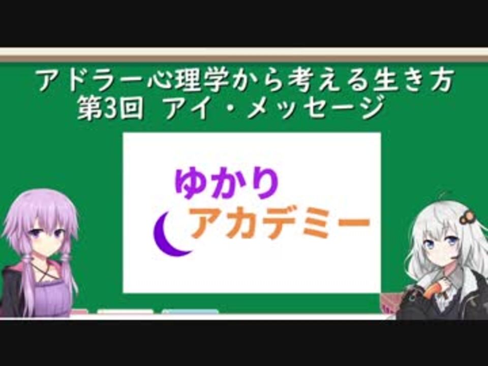 フォントなど一部動画構成を変更してみましたが、いかがでしょうか。<br />拙い編集ではありますが、分かりやすい動画を目指して精進していきたいです。<br /><br />本講座「アドラー心理学から考える生き方」はとりあえず全5回、<br />その後は様々なテーマを扱っていこうと考えています。<br /><br />ゆかりアカデミー マイリスト <a href="https://www.nicovideo.jp/mylist/61189424" target="_blank" rel="noopener">mylist/61189424</a><br /><font color="#333333">前回:</font><a href="https://www.nicovideo.jp/watch/sm32879554" class="watch">sm32879554</a><font color="#333333"> 次回:</font><a href="https://www.nicovideo.jp/watch/sm33250874" class="watch">sm33250874</a><br /><br /><font color="#333333">前回広告者様(4/4現在)</font>スン さんRai さん ありがとうございます。 <br /><font color="#333333">再生・コメント・マイリス・フォロー等々ありがとうございます。</font>