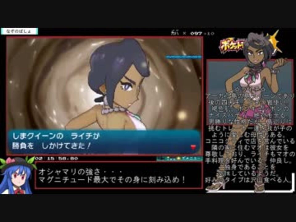 脳みそ空っぽ気持ちいいぃぃ<br /><br />チャートはこちらのものを使用させて頂きました <a href="https://ch.nicovideo.jp/article/ar1145650" target="_blank" rel="noopener">ar1145650</a><br /><br />メモリアルヒル~マーマネ試練挑戦まで<br />パート4→<a href="https://www.nicovideo.jp/watch/sm33001031" class="watch">sm33001031</a> パート6→<a href="https://www.nicovideo.jp/watch/sm33049171" class="watch">sm33049171</a> <a href="https://www.nicovideo.jp/mylist/61288148" target="_blank" rel="noopener">mylist/61288148</a> <br />これまで動画→<a href="https://www.nicovideo.jp/mylist/59823194" target="_blank" rel="noopener">mylist/59823194</a><br /><br />粘質兄貴、オルゴ・デミーラ氏、mikado氏、まごにゃんこ氏、シズク氏、azs姉貴、一般市民兄貴、牡蠣氷兄貴(まずい!もう一杯!)、minami様、アリエッタ氏、purio氏、セピー氏、デンジュモク兄貴、リュウヤ氏、金剛氏、ステファ氏、Nekuron氏、そそね氏、7☆様、Quartz様、pon氏、お菓子め~か~兄貴、pLafca氏、はづき氏、ゆめみぐそ氏、AZ兄貴、凡人の錯覚兄貴、まゆりん氏、citrus氏、ゼラオラ兄貴、TKNK氏、光葉氏、ゆきもひ氏、双瀬氏、KENT氏、ゲス氏、rio氏、狐月氏、ねこだいすき氏(いぬもいいぞ!)、カタドガス氏、ふぇるす氏、アンダー氏、ゆくえふめい兄貴、yo氏、産地直送おこめ券兄貴、わいと兄貴、深夜歩き兄貴、ブーン兄貴、ふぃー氏、loiter氏、Hamigaki-ko兄貴(クリニカ!)、オウヨ氏、れいんだむ氏、アドリアP兄貴、二条院羽月氏、港湾労働者組合兄貴、坂ノ上オコジョ氏、コテハンどうしよう氏、ウハ氏、猫の鈴氏、141氏、宣伝ありがとナス!!こういうとき、どんな顔すればいいかわからないよ!<br />