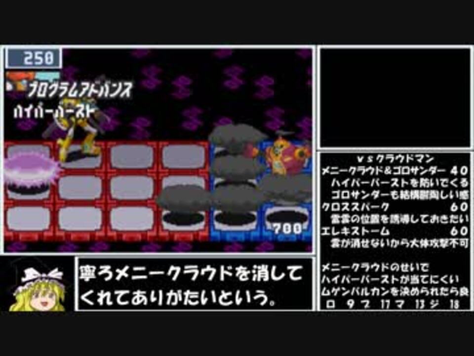 第8話 「闇の雲に潜む悪夢」 縛り内容を一部変更。B+←禁止っていうのを交戦中Bボタン禁止に。<br />ロックバスター禁止が縛り内容に入ってなかったって話。交戦中ってのは戦闘中のチップ選択後のことね。<br />今回の主な制限も、ストーリーをP・Aだけでクリアするというものです。詳細はマイリストにあります。<br /><br /><b>ロックマンエグゼ5(本シリーズ)</b> <a href="https://www.nicovideo.jp/mylist/60485072" target="_blank" rel="noopener">mylist/60485072</a><br />他投稿動画のPart1まとめ <a href="https://www.nicovideo.jp/mylist/54759285" target="_blank" rel="noopener">mylist/54759285</a><br /><br />第7話 <a href="https://www.nicovideo.jp/watch/sm33013017" class="watch">sm33013017</a> 第9話 <a href="https://www.nicovideo.jp/watch/sm33223949" class="watch">sm33223949</a><br /><br />ついったー(リベレートミッションが近づくとクリアフェイズ予想とかやってるよ)<br /> <a href="https://twitter.com/J_NEX_PA" target="_blank" rel="noopener nofollow">https://twitter.com/J_NEX_PA</a>