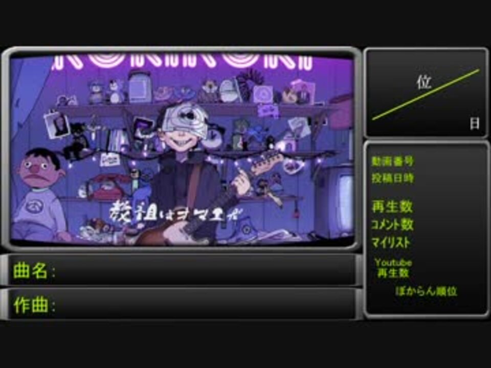 | 番号 | 総合順位 | ポイント | ジャンル順位 | カテゴリ | 再生順位 | 再生数 | コメント順位 | コメント数 | マイリスト順位 | マイリスト数 | いいね順位 | いいね数 |