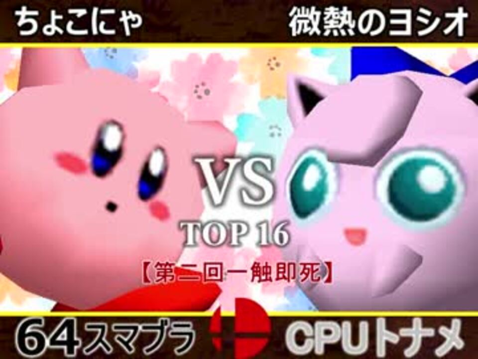 クソザコ候補対決<br />※どちらが勝つかアンケ結果(Twitter調べ)<br />ちょこにゃ(KI) 52% VS 微熱のヨシオ(PU) 48% <br /><br /><font color="#0000ff"><u>※64スマブラCPUトナメ実況のwikiができた模様</u>→</font> <a href="https://wiki3.jp/cpu_64" target="_blank" rel="noopener nofollow">https://wiki3.jp/cpu_64</a><br /><br /><b><font size="5"><font color="#ff0000">次→</font></font></b>【<a href="https://www.nicovideo.jp/watch/sm33100878" class="watch">sm33100878</a>】※毎日投稿<br /><br />前【<a href="https://www.nicovideo.jp/watch/sm33084731" class="watch">sm33084731</a>】 一回戦第一試合【<a href="https://www.nicovideo.jp/watch/sm33080922" class="watch">sm33080922</a>】<br /><br />第二回マイリスト【<a href="https://www.nicovideo.jp/mylist/61420308" target="_blank" rel="noopener">mylist/61420308</a>】<br />64スマブラCPUトナメ実況part1まとめ【<a href="https://www.nicovideo.jp/mylist/60846861" target="_blank" rel="noopener">mylist/60846861</a>】<br />その他シリーズ【<a href="https://www.nicovideo.jp/mylist/12965027" target="_blank" rel="noopener">mylist/12965027</a>】<br /><br /><b><font color="#00bfff">Twitter</font></b>【@niconicopppppp】<br /><b><font color="#ff4500">チャンネル</font></b>【<a href="https://ch.nicovideo.jp/p-desu" target="_blank" rel="noopener">ch.nicovideo.jp/p-desu</a>】
