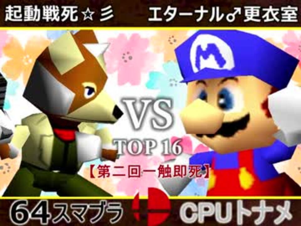 更衣室に連れ込まれてしまうのか<br />※どちらが勝つかアンケ結果(Twitter調べ)<br />起動戦死☆彡(FO) 35% VS エターナル♂更衣室(MA) 65% <br /><br /><font color="#0000ff"><u>※64スマブラCPUトナメ実況のwikiができた模様</u>→</font> <a href="https://wiki3.jp/cpu_64" target="_blank" rel="noopener nofollow">https://wiki3.jp/cpu_64</a><br /><br /><b><font size="5"><font color="#ff0000">次→</font></font></b>【<a href="https://www.nicovideo.jp/watch/sm33101845" class="watch">sm33101845</a>】※毎日投稿<br /><br />前【<a href="https://www.nicovideo.jp/watch/sm33097176" class="watch">sm33097176</a>】 一回戦第一試合【<a href="https://www.nicovideo.jp/watch/sm33080922" class="watch">sm33080922</a>】<br /><br />第二回マイリスト【<a href="https://www.nicovideo.jp/mylist/61420308" target="_blank" rel="noopener">mylist/61420308</a>】<br />64スマブラCPUトナメ実況part1まとめ【<a href="https://www.nicovideo.jp/mylist/60846861" target="_blank" rel="noopener">mylist/60846861</a>】<br />その他シリーズ【<a href="https://www.nicovideo.jp/mylist/12965027" target="_blank" rel="noopener">mylist/12965027</a>】<br /><br /><b><font color="#00bfff">Twitter</font></b>【@niconicopppppp】<br /><b><font color="#ff4500">チャンネル</font></b>【<a href="https://ch.nicovideo.jp/p-desu" target="_blank" rel="noopener">ch.nicovideo.jp/p-desu</a>】