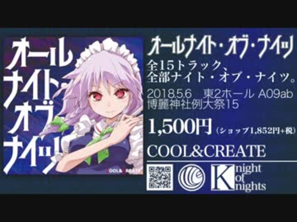 全15トラック、全部ナイト・オブ・ナイツ。<br /><a href="http://cool-create.cc/cd/cccd50/" target="_blank" rel="noopener nofollow">http://cool-create.cc/cd/cccd50/</a><br />多彩なメンバーによる、全15トラック、全部ナイト・オブ・ナイツ。<br /> <br />2018.5.6 博麗神社例大祭15 <font color="#666666"><br /></font>東2ホール A09ab「COOL&CREATE」 <br />1,500円(ショップ1,852円+税)<br />取扱ショップ:メロンブックス とらのあな あきばお~ アニメイト DIVERSE DIRECT アキバホビー グレップ <br /><br /> ■アレンジ・リミックス<br />A-One、Cranky(Feline Groove) 、IOSYS 、Masayoshi Minoshima、t+pazolite(C.H.S) 、暁Records 、あきやまうに(うにぼく)、狐夢想 、ジュクチョー 、少女理論観測所、魂音泉 、東京アクティブNEETs 、豚乙女 、まらしぃ<font color="#666666"><br /><br /></font>東方ギタージュク・天<a href="https://www.nicovideo.jp/watch/sm33128815" class="watch">sm33128815</a><br />