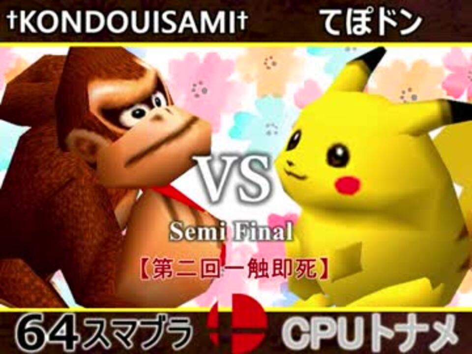 最強 VS 最弱<br />※どちらが勝つかアンケ結果(Twitter調べ)<br />†KONDOUISAMI†(DK) 69% VS てぽドン(PI) 31% <br /><br /><font color="#0000ff"><u>※64スマブラCPUトナメ実況のwikiができた模様</u>→</font> <a href="https://wiki3.jp/cpu_64" target="_blank" rel="noopener nofollow">https://wiki3.jp/cpu_64</a><br /><br /><b><font size="5"><font color="#ff0000">次→</font></font></b>【<a href="https://www.nicovideo.jp/watch/sm33142959" class="watch">sm33142959</a>】※毎日投稿<br /><br />前【<a href="https://www.nicovideo.jp/watch/sm33128646" class="watch">sm33128646</a>】 一回戦第一試合【<a href="https://www.nicovideo.jp/watch/sm33080922" class="watch">sm33080922</a>】<br /><br />第二回マイリスト【<a href="https://www.nicovideo.jp/mylist/61420308" target="_blank" rel="noopener">mylist/61420308</a>】<br />64スマブラCPUトナメ実況part1まとめ【<a href="https://www.nicovideo.jp/mylist/60846861" target="_blank" rel="noopener">mylist/60846861</a>】<br />その他シリーズ【<a href="https://www.nicovideo.jp/mylist/12965027" target="_blank" rel="noopener">mylist/12965027</a>】<br /><br /><b><font color="#00bfff">Twitter</font></b>【@niconicopppppp】<br /><b><font color="#ff4500">チャンネル</font></b>【<a href="https://ch.nicovideo.jp/p-desu" target="_blank" rel="noopener">ch.nicovideo.jp/p-desu</a>】
