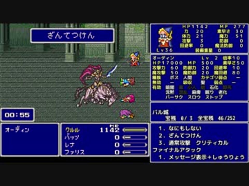 乱数 VS 乱数<br>乱数とは、サイコロの出目のように規則性がなく予測不能な数値のこと。<br><br>★縛り内容★<br>魔法のみ(白黒時召青)<br>全裸<br>魔法以外の行動不可<br>魔法を使えるジョブのみ<br>アクティブスピード1<br>宝箱回収率100%<br>アイテムの使用は移動中のセーブ可能な場所でのみ<br>勝率0%確定したら最小限のその時だけの解放を考えて続行する<br>ボスを即死等であっさり倒したら使わない戦闘も頑張る<br><br>FF5一覧…<a href="https://www.nicovideo.jp/mylist/56239646" target="_blank" rel="noopener">mylist/56239646</a><br><br>字幕のみPart48…<a href="https://youtu.be/9R_ss12iQjo" target="_blank" rel="noopener nofollow">https://youtu.be/9R_ss12iQjo</a><br><br>○前回○ Part47…<a href="https://www.nicovideo.jp/watch/sm33119636" class="watch">sm33119636</a><br>○次回○ Part49…<a href="https://www.nicovideo.jp/watch/sm33234980" class="watch">sm33234980</a><br><br>Youtube版 …<a href="https://youtu.be/OLvXk6j0MZM" target="_blank" rel="noopener nofollow">https://youtu.be/OLvXk6j0MZM</a><br /><br>ふよふよしているの<br>絵:横沢さわらさん VOICEVOX:WhiteCUL<br><br>【シリーズ】<br>くうねるきゃんぷ … <a href="https://www.nicovideo.jp/series/516069" target="_blank" rel="noopener">series/516069</a><br>お写んぽ! … <a href="https://www.nicovideo.jp/series/435756" target="_blank" rel="noopener">series/435756</a><br>様子がおかしい! … <a href="https://www.nicovideo.jp/series/418875" target="_blank" rel="noopener">series/418875</a><br>FF7 魔法マテリアのみ初期防具ガールズ一人旅ASM … <a href="https://www.nicovideo.jp/series/438696" target="_blank" rel="noopener">series/438696</a><br>きんかつ!V-STROM1050XT … <a href="https://www.nicovideo.jp/series/144466" target="_blank" rel="noopener">series/144466</a><br>FF6 魔法のみ全裸ガールズ一人旅AS1 … <a href="https://www.nicovideo.jp/series/9438" target="_blank" rel="noopener">series/9438</a><br>おバイク!GLADIUS400 ABS … <a href="https://www.nicovideo.jp/series/68579" target="_blank" rel="noopener">series/68579</a><br>FF5 魔法のみ全裸一人旅AS1 … <a href="https://www.nicovideo.jp/series/9432" target="_blank" rel="noopener">series/9432</a><br>DQ3 呪文のみ全裸一人旅 … <a href="https://www.nicovideo.jp/series/9416" target="_blank" rel="noopener">series/9416</a><br>DQ2 ムーンブルクの王女一人旅 … <a href="https://www.nicovideo.jp/series/9414" target="_blank" rel="noopener">series/9414</a><br>DQ1 全裸 … <a href="https://www.nicovideo.jp/series/9412" target="_blank" rel="noopener">series/9412</a><br>FE 紋章の謎 天馬騎士単騎 第2部 英雄戦争 … <a href="https://www.nicovideo.jp/series/9404" target="_blank" rel="noopener">series/9404</a><br>FE 紋章の謎 天馬騎士単騎 第1部 暗黒戦争 … <a href="https://www.nicovideo.jp/series/9401" target="_blank" rel="noopener">series/9401</a><br>聖剣2 全裸プリム一人旅 武器Lv1など … <a href="https://www.nicovideo.jp/series/9396" target="_blank" rel="noopener">series/9396</a><br>ロマサガ2 魔術士不得意武器のみ … <a href="https://www.nicovideo.jp/series/9388" target="_blank" rel="noopener">series/9388</a><br>ロマサガ1 術法のみ一人旅で各イベント攻略 … <a href="https://www.nicovideo.jp/series/9386" target="_blank" rel="noopener">series/9386</a><br><br>SNSとか色々なリンク … <a href="https://lit.link/Unaa" target="_blank" rel="noopener nofollow">https://lit.link/Unaa</a>