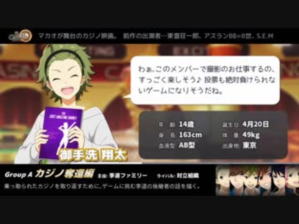 <font size="2">現在ゲーム内で開催中の「パッション爆裂!イベント続編大作戦!」でのグループやアイドルたちの意気込みとこれまでの演技のお仕事も簡単にまとめました。<br />(キャンペーンの詳しい内容はゲーム内でご確認ください)<br /></font><font size="2"><br />パッションを最も多く獲得したグループは<font color="#e69138">続編制作&CD発売</font>!<br />各グループやアイドルの<font color="#e69138">PRコメント</font>をお待ちしております。<br /></font><font size="2"><br />グループA <a href="#" class="seekTime" data-seekTime="0:04" onclick="seekNicoPlayer('#0:04'); return false;">#0:04</a> グループB <a href="#" class="seekTime" data-seekTime="2:04" onclick="seekNicoPlayer('#2:04'); return false;">#2:04</a><br />グループC <a href="#" class="seekTime" data-seekTime="4:08" onclick="seekNicoPlayer('#4:08'); return false;">#4:08</a> グループD <a href="#" class="seekTime" data-seekTime="6:08" onclick="seekNicoPlayer('#6:08'); return false;">#6:08</a><br />グループE <a href="#" class="seekTime" data-seekTime="8:12" onclick="seekNicoPlayer('#8:12'); return false;">#8:12</a> グループF <a href="#" class="seekTime" data-seekTime="10:12" onclick="seekNicoPlayer('#10:12'); return false;">#10:12</a><br />グループG <a href="#" class="seekTime" data-seekTime="12:16" onclick="seekNicoPlayer('#12:16'); return false;">#12:16</a> グループH <a href="#" class="seekTime" data-seekTime="13:56" onclick="seekNicoPlayer('#13:56'); return false;">#13:56</a><br />PRタイム <a href="#" class="seekTime" data-seekTime="15:36" onclick="seekNicoPlayer('#15:36'); return false;">#15:36</a><br /></font><font size="2"><br />マイリスト【<a href="https://www.nicovideo.jp/mylist/55744376" target="_blank" rel="noopener">mylist/55744376</a>】</font>