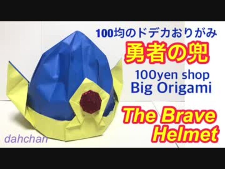 Special Thanks! : あいうえおさま☆ <br /> neibi さま☆」<br />*************<br /><br />ご覧いただきありがとうございます♪<br /><br />100円ショップにあるどでかいおりがみを使って<br />勇者の兜っぽいものを作ってみました☆<br /><br />実際にかぶって遊べます☆よかったら作ってみてね☆<br /><br /><br />今回は倍速(あるいはそれ以上)にしております<br />前に投稿した兜は途中まで折り方が同じでゆっくりした動画です<br />こちら↓<br /><a href="https://www.nicovideo.jp/watch/sm32840549" class="watch">sm32840549</a><br /><br /><br />剣と盾も作ってますので合わせて作って装備して遊んでね☆<br />勇者の盾(っぽいの)<a href="https://www.nicovideo.jp/watch/sm33155851" class="watch">sm33155851</a><br />勇者の剣(っぽいの)<a href="https://www.nicovideo.jp/watch/sm33145722" class="watch">sm33145722</a><br /><br />☆☆☆☆<br /><br />音楽提供★甘茶の音楽工房さま(春の予感)<br /><br />他折り紙作品はこちら→<a href="https://www.nicovideo.jp/mylist/56634401" target="_blank" rel="noopener">mylist/56634401</a><br />ついったー垢→@dachan2525<br />いんすた垢→@dachan25