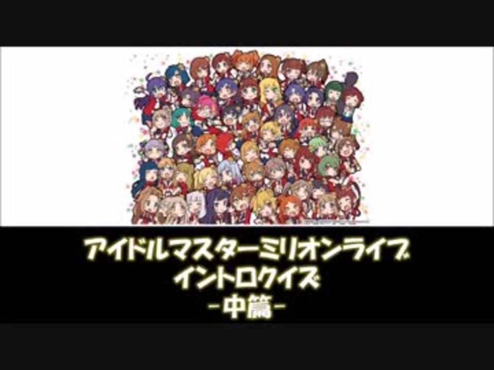 <b>プロデューサーたるものイントロの時点でサイリウムを準備するのは当然</b> ということで5thライブ直前にイントロクイズに挑戦してみませんか?<br /><br />出題曲数120問、3回に分けて投稿する予定のイントロクイズの中編です。<br />再生開始8秒頃から問題が開始します。 <br />※問題の間隔が短めなので一時停止しながら挑戦してください。<br /><br />前篇:<a href="https://www.nicovideo.jp/watch/sm33167182" class="watch">sm33167182</a> 後篇:<a href="https://www.nicovideo.jp/watch/sm33239036" class="watch">sm33239036</a><br /> <a href="https://www.nicovideo.jp/mylist/61757409" target="_blank" rel="noopener">mylist/61757409</a><br /><br />参考にさせていただいた動画:<a href="https://www.nicovideo.jp/watch/sm24304581" class="watch">sm24304581</a> <a href="https://www.nicovideo.jp/watch/sm27093464" class="watch">sm27093464</a><br /><br />文字のサイズやクイズの時間等修正点があったらコメントしていただけると幸いです <br />沢山の挑戦や広告ありがとうございます<br /><br />