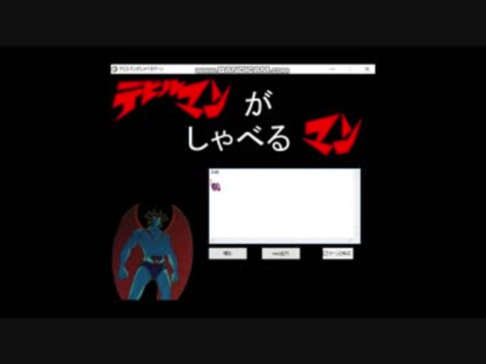 デビルマンを喋らせてみました<br />どうやら私は二番煎じのようです<br /><br />先代様 : <font color="#cc0000"><a href="https://www.nicovideo.jp/watch/sm33109604" class="watch">sm33109604</a></font> <br />ありがたき幸せ : <a href="https://www.nicovideo.jp/watch/sm32946313" class="watch">sm32946313</a><br /><br />ここからダウンロードできます<br />Windows専用です<br /><a href="https://www.dropbox.com/s/ovf2jr6j5byfew1/%E5%96%8B%E3%82%8B%E3%83%87%E3%83%93%E3%83%AB%E3%83%9E%E3%83%B3.zip?dl=0" target="_blank" rel="noopener nofollow">https://www.dropbox.com/s/ovf2jr6j5byfew1/%E5%96%8B%E3%82%8B%E3%83%87%E3%83%93%E3%83%AB%E3%83%9E%E3%83%B3.zip?dl=0</a><br /><br />エラーが起きる場合はtwitterのDMまで<br /><a href="https://twitter.com/cubemusicjp" target="_blank" rel="noopener nofollow">https://twitter.com/cubemusicjp</a><br /><br /><font size="3"><u>2018/05/14 : wav出力機能追加 </u></font><br /><font size="3"><u>2018/05/14 : wav出力エラーの修正</u></font><font size="3"><u><br /><br /></u></font>