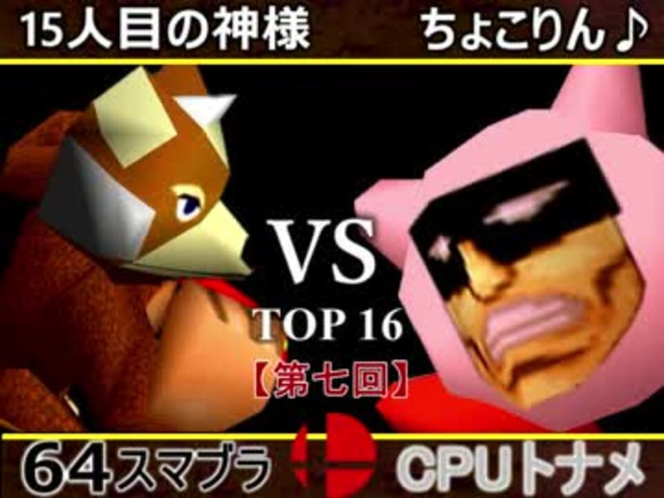ディフェンディングチャンピオンの登場(×TOP16 〇TOP8)<br />※どちらが勝つかアンケ結果(Twitter調べ)<br />15人目の神様(天才×神様) 69% VS ちょこりん♪(ちょこにゃ ×ドルコリン♪) 31% <br /><br /><font color="#0000ff"><u>※64スマブラCPUトナメ実況のwikiができた模様</u>→</font> <a href="https://wiki3.jp/cpu_64" target="_blank" rel="noopener nofollow">https://wiki3.jp/cpu_64</a><br /><br /><b><font size="5"><font color="#ff0000">次→</font></font></b>【<a href="https://www.nicovideo.jp/watch/sm33221420" class="watch">sm33221420</a>】※毎日投稿<br /><br />前【<a href="https://www.nicovideo.jp/watch/sm33212554" class="watch">sm33212554</a>】 一回戦第一試合【<a href="https://www.nicovideo.jp/watch/sm33183042" class="watch">sm33183042</a>】<br /><br />第七回マイリスト【<a href="https://www.nicovideo.jp/mylist/61916925" target="_blank" rel="noopener">mylist/61916925</a>】<br />64スマブラCPUトナメ実況part1まとめ【<a href="https://www.nicovideo.jp/mylist/60846861" target="_blank" rel="noopener">mylist/60846861</a>】<br />その他シリーズ【<a href="https://www.nicovideo.jp/mylist/12965027" target="_blank" rel="noopener">mylist/12965027</a>】<br /><br /><b><font color="#00bfff">Twitter</font></b>【@niconicopppppp】<br /><b><font color="#ff4500">チャンネル</font></b>【<a href="https://ch.nicovideo.jp/p-desu" target="_blank" rel="noopener">ch.nicovideo.jp/p-desu</a>】