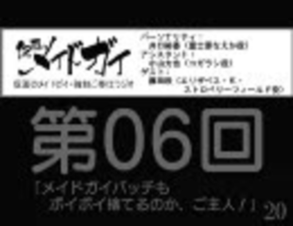 ※無音動画【第06回】2008/05/15配信分 <a href="http://www.animate.tv/digital/web_radio/detail_131.html←音声は本家からどうぞ" target="_blank" rel="noopener nofollow">http://www.animate.tv/digital/web_radio/detail_131.html←音声は本家からどうぞ</a>。動画のカウントダウンにあわせて、ラジオを再生してください。【マイリスト】<a href="https://www.nicovideo.jp/mylist/6488074" target="_blank" rel="noopener">mylist/6488074</a><br />【おまけ】「kk」「kk」→「きゅいんきゅいん♪」のフィルターあります。<br /><br />1)カウントダウンSEあります(今回はゲストさんにちなんで特別製)。タイミング合わせにご活用下さい。<br />2)本編前約20秒/後約10秒の計31秒です。(ちょっとミスりました。すいません。)残り時間把握の目安にして下さい。<br />3)カウントダウンシーケンスに修正/改訂を加えました。<br />4)PGMを全面改装しエンドテロップを試行で実装してみました。が、精進の必要ありです。<br />5)次回投稿も22時ぐらいかと思います。申し訳ないです。