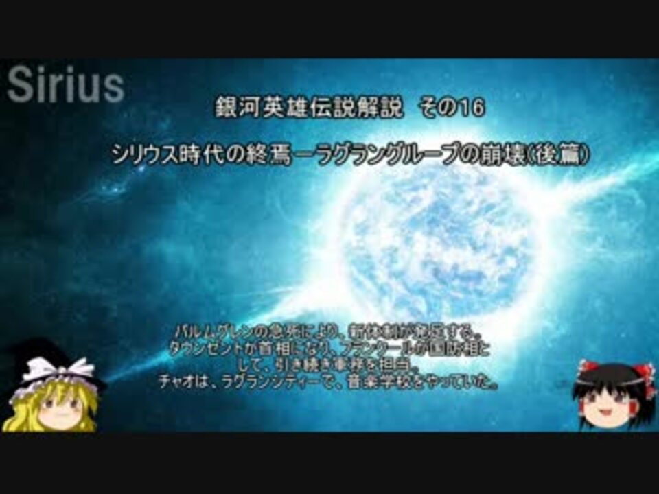 地球滅亡後はシリウスを中心とした、新秩序が構築されるかに見えた。<br />しかし地球滅亡の二年後、政治指導者のパルムグレンは急死した。<br />そして、シリウスのラグラングループに亀裂が走る。<br />シリウス及び植民星の運命はいかに・・・<br /><br />第01話 <a href="https://www.nicovideo.jp/watch/sm33175734" class="watch">sm33175734</a><br />第17話 近日公開<br />第15話 <a href="https://www.nicovideo.jp/watch/sm33228042" class="watch">sm33228042</a><br /><br />マイリスト <a href="https://www.nicovideo.jp/mylist/12818453" target="_blank" rel="noopener">mylist/12818453</a><br />コミュニティ co3805222<br /><br />