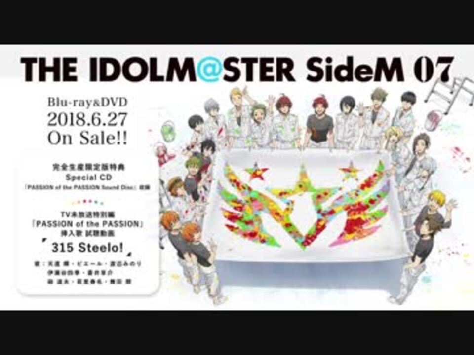 <a href="https://youtu.be/2GukNwiSkEA" target="_blank" rel="noopener nofollow">https://youtu.be/2GukNwiSkEA</a><br /><br /><a href="http://imas-sidem.com/" target="_blank" rel="noopener nofollow">http://imas-sidem.com/</a><br /><br />6月27日(水)発売『アイドルマスター SideM』Blu-ray&DVD第7巻<br />完全生産限定版特典<br />Special CD「PASSION of the PASSION Sound Disc」収録<br /><br />TV未放送特別編「PASSION of the PASSION」<br />挿入歌「315 Steelo!」先行試聴実施中!<br />歌:天道 輝・ピエール・渡辺みのり・伊瀬谷四季・蒼井享介・硲 道夫・若里春名・舞田 類<br /><br />