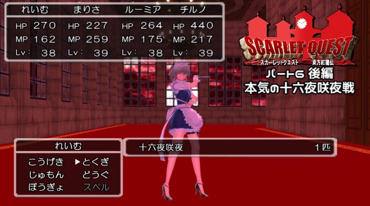 初めての方ははじめまして。ご存知の方はお久しぶりです。<br>"4ヶ月ぶり"に復活しましたマリアーノです。<br>今年に入ってからいろんな用事ができたりパソコンがぶっ壊れたりしたためになかなか動画制作がはかどらない状況だったのですが……<br>ついに!!なんとか!!<br>動画を完成させることができました!!<br>お待たせしてしまった皆様、誠に申し訳ありませんでした!!<br>これからもこんな私の動画をどうかよろしくお願いします!<br><br>今回の霊夢達の相手はまたしても十六夜咲夜。まさかの再戦となります。<br>DQ6のムドー並みに本気を出した彼女は、<br>両手に短剣を構えた二刀流スタイルで襲いかかってきます。<br>果たして彼女の復讐は……果たされるのでしようか?<br><br>sugarPlusさんが、今回の東方紅龍伝の戦闘BGMとして「月時計 ~ ルナ・ダイアル」のアレンジ楽曲を特別提供してくださいました!<br>こちらもチェックしてみてください!<br>sugarPlusさんのユーザーページ→<a href="https://www.nicovideo.jp/user/77626930" target="_blank" rel="noopener">user/77626930</a><br>特別提供楽曲→<a href="https://www.nicovideo.jp/watch/sm32701826" class="watch">sm32701826</a><br><br>【追記】<br>10000回再生ありがとうございます!!<br>時間を操るキャラというのは、どうしてこうも魅力的なんでしょうか……<br><br>中編→<a href="https://www.nicovideo.jp/watch/sm32493014" class="watch">sm32493014</a><br>次作→<a href="https://www.nicovideo.jp/watch/sm33753933" class="watch">sm33753933</a><br>「東方紅龍伝~SCARLET QUEST」全話リスト→<u><a href="https://www.nicovideo.jp/mylist/37019390" target="_blank" rel="noopener">mylist/37019390</a></u><br>今まで投稿した動画→<u><a href="https://www.nicovideo.jp/mylist/57837162" target="_blank" rel="noopener">mylist/57837162</a></u><br>Twitterアカウント→<a href="https://twitter.com/marvelous_2525" target="_blank" rel="noopener nofollow">https://twitter.com/marvelous_2525</a><br>