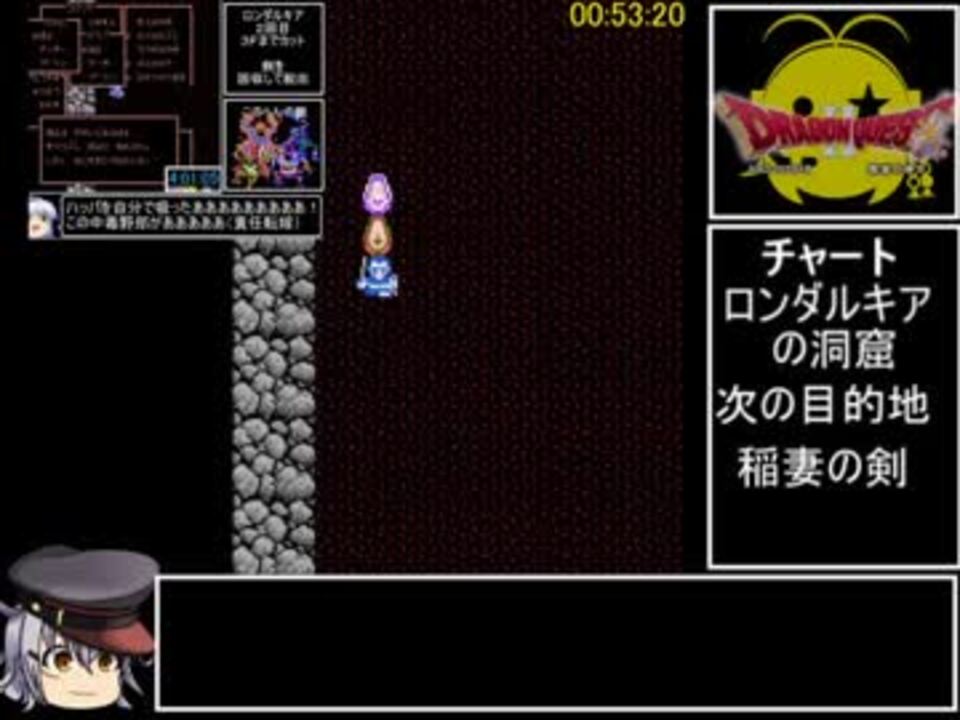 <font color="#262626">特にネタは思いつきませんでした許してください</font><br /><font color="#262626">まだ素人投稿者ですので毎回コメントで色々な指摘を受けて学習させてもらってます</font><br /><font color="#ffffff">ただし再送要求は銃殺刑かシベリア送りです<br /></font><br /><font size="3"><b>【ルール説明】</b></font><br />・デルコンダルにシドーを召喚して倒す<br />・バグった画面を潜り抜けてローレシアに戻り『<font color="#ff0000">エンディング</font>を見る』<font color="#ffffff">(2敗</font><br /><br /><br />Q.稲妻の剣いる?<br />A.多分無いと火力が足りないと思うんですよね<br />主にアトラスとシドーで<br /><br />Q.金の鍵の位置<br />A. 走者がガバらないなら便利な位置ですね<font color="#ffffff">まぁ私はガバりますけど</font><br /><br />Q.聖水の効果<br />A.ローレの攻撃力参照なので武器持ち替えるだけで変更されます<br />(厳密にはローレシアの王子の攻撃力/2≧敵パーティで一番高い攻撃力+1 )<br /><br />Q.再走予定は?<br />A.少なくとも私は無いです<br /><br />Q.乱数調整<br />A. してないしてない。むしろやり方知らんです<br /><br /><br />前回→<a href="https://www.nicovideo.jp/watch/sm33335384" class="watch">sm33335384</a><br />次回→<a href="https://www.nicovideo.jp/watch/sm33526921" class="watch">sm33526921</a><br />パート1→<a href="https://www.nicovideo.jp/watch/sm33320732" class="watch">sm33320732</a><br /><br />偉大なる先代走者様の動画→<a href="https://www.nicovideo.jp/watch/sm32243723" class="watch">sm32243723</a><br />ずんちゃんの動画→<a href="https://www.nicovideo.jp/watch/sm33419207" class="watch">sm33419207</a><br /><font color="#262626"><br />【追記】<br />牢屋の鍵タグを反省としてロックしました<br /></font>大車が混ざるのはともかくナチころおじさん混じるのは想定外でした<br />