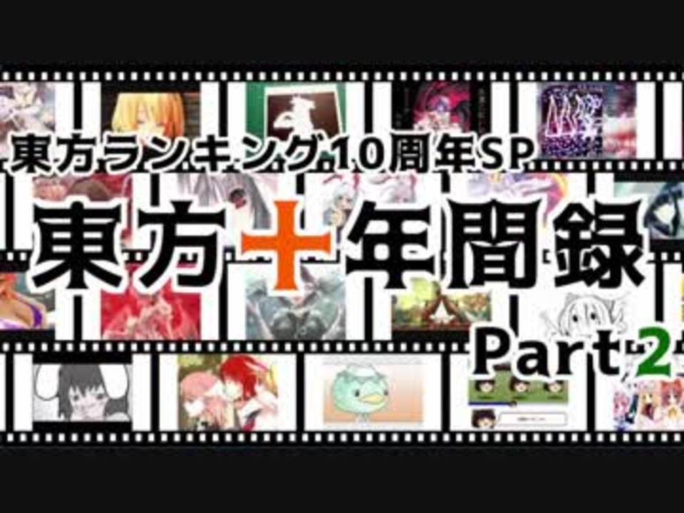 大変お待たせしました。<br />東方ランキング10周年記念SP・東方十年間録のPart2です。<br /><br />※集計期間、集計方法等については Part1を確認してください。<br />----------<br />←Part1 <a href="https://www.nicovideo.jp/watch/sm33365746" class="watch">sm33365746</a> || Part3 <a href="https://www.nicovideo.jp/watch/sm33361466" class="watch">sm33361466</a> / Part4 <a href="https://www.nicovideo.jp/watch/sm33366906" class="watch">sm33366906</a> → <br />----------<br />◆プレイリスト:<a href="https://www.nicovideo.jp/mylist/62384188" target="_blank" rel="noopener">mylist/62384188</a><br />◆OP曲:<a href="https://www.nicovideo.jp/watch/nm14901181" class="watch">nm14901181</a><br />◆ED曲:<a href="https://www.nicovideo.jp/watch/nm6787132" class="watch">nm6787132</a><br />----------<br />◆CM:<a href="https://www.nicovideo.jp/watch/sm32827011" class="watch">sm32827011</a><br /><br />==============================<br />第10回東方ニコ童祭は、<br />2018年7月13日(金)21時~16日(月・祝)24時開催です!<br />特設サイト:nicodosai.com/10th/<br />==============================