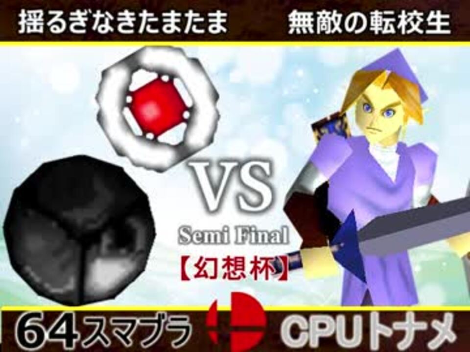 決勝に行くのは?!<br />※どちらが勝つかアンケ結果(Twitter調べ) <br />揺るぎなきたまたま(SA) 46% VS 無敵の転校生(LI) 54%<br /><br /><font color="#0000ff"><u>※64スマブラCPUトナメ実況のwikiができた模様</u>→</font> <a href="https://wiki3.jp/cpu_64" target="_blank" rel="noopener nofollow">https://wiki3.jp/cpu_64</a><br /><br /><b><font size="5"><font color="#ff0000">次→</font></font></b>【<a href="https://www.nicovideo.jp/watch/sm33372906" class="watch">sm33372906</a>】※毎日投稿<br /><br />前【<a href="https://www.nicovideo.jp/watch/sm33364797" class="watch">sm33364797</a>】 一回戦第一試合【<a href="https://www.nicovideo.jp/watch/sm33292256" class="watch">sm33292256</a>】<br /> <br />幻想杯マイリスト【<a href="https://www.nicovideo.jp/mylist/62171629" target="_blank" rel="noopener">mylist/62171629</a>】 <br />64スマブラCPUトナメ実況part1まとめ【<a href="https://www.nicovideo.jp/mylist/60846861" target="_blank" rel="noopener">mylist/60846861</a>】<br />その他シリーズ【<a href="https://www.nicovideo.jp/mylist/12965027" target="_blank" rel="noopener">mylist/12965027</a>】<br /><br /><b><font color="#00bfff">Twitter</font></b>【<a href="https://twitter.com/niconicopppppp】" target="_blank" rel="noopener nofollow">https://twitter.com/niconicopppppp】</a><br /><b><font color="#ff4500">チャンネル</font></b>【<a href="https://ch.nicovideo.jp/p-desu" target="_blank" rel="noopener">ch.nicovideo.jp/p-desu</a>】