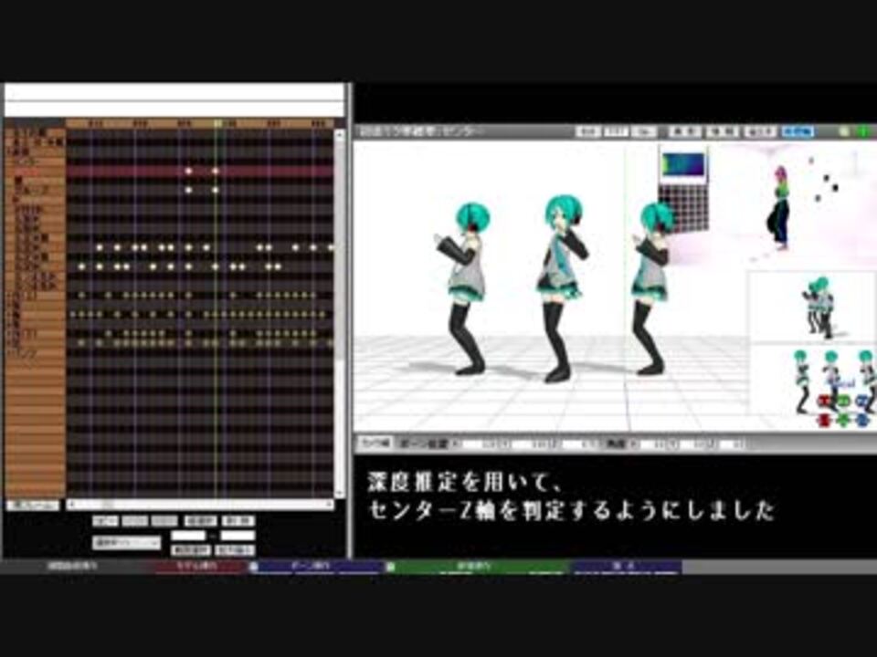 ・深度推定を用いて、センターZ軸を判定するようにしました<br>・足IKの止めの動作を追加しました。<br>・間引き角度の初期パラメータ値を減らしました。<br><br>ver0.09 → <a href="https://www.nicovideo.jp/watch/sm33981382" class="watch">sm33981382</a><br><br>Github反映。<br>Qiitaに導入手順UPしました。→ <a href="https://qiita.com/miu200521358/items/9b45c181c4fd39be9c21" target="_blank" rel="noopener nofollow">https://qiita.com/miu200521358/items/9b45c181c4fd39be9c21</a><br><br>【ご本家】<br>楽曲:Neru様 <a href="https://www.nicovideo.jp/watch/sm32921516" class="watch">sm32921516</a><br>踊り:Babo様 <a href="https://www.nicovideo.jp/watch/sm33220501" class="watch">sm33220501</a><br> 利用許諾ありがとうございます!<br><br>【使用技術・ライセンス】<br>Openpose:CMU:非商用であれば無料利用可能(商用利用はライセンス要購入)。スポーツ分野利用制限アリ。<br> … <a href="https://github.com/CMU-Perceptual-Computing-Lab/openpose" target="_blank" rel="noopener nofollow">https://github.com/CMU-Perceptual-Computing-Lab/openpose</a><br>起動バッチ:miu200521358:GNU GPLv3 <br> … <a href="https://github.com/miu200521358/openpose-simple" target="_blank" rel="noopener nofollow">https://github.com/miu200521358/openpose-simple</a><br>Openpose→3D変換:una-dinosauria, ArashHosseini, miu200521358:MIT<br> … <a href="https://github.com/miu200521358/3d-pose-baseline-vmd" target="_blank" rel="noopener nofollow">https://github.com/miu200521358/3d-pose-baseline-vmd</a><br>深度推定:Iro Laina, miu200521358:Simplified BSD License<br> … <a href="https://github.com/miu200521358/FCRN-DepthPrediction-vmd" target="_blank" rel="noopener nofollow">https://github.com/miu200521358/FCRN-DepthPrediction-vmd</a><br>3D→VMD変換: errno-mmd, miu200521358:GNU GPLv3 <br> … <a href="https://github.com/miu200521358/VMD-3d-pose-baseline-multi" target="_blank" rel="noopener nofollow">https://github.com/miu200521358/VMD-3d-pose-baseline-multi</a><br><br>挑戦の記録: <a href="https://www.nicovideo.jp/mylist/61943776" target="_blank" rel="noopener">mylist/61943776</a> <br>