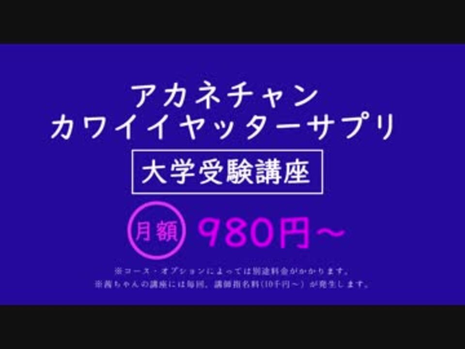 某CMのパロディ動画。 <font color="#2a2a2a"> </font><font color="#2a2a2a"> 大学受験英語を教える茜ちゃんやで。</font><br /><font color="#2a2a2a">普段作っている動画の続きじゃなくても! <br /></font><font color="#2a2a2a">再生数が伸びなくても! </font><br /><font color="#2a2a2a">やりたい事を動画に出来るのがVOICEROIDだって証明したい!!!</font> <br /><s>万が一もあり得ませんが、そこそこ伸びたらこれの本編も作ります</s><br /><br />普段はこういう動画を作ってます。<br />・きりたんが男を知る解説動画シリーズpart1→<a href="https://www.nicovideo.jp/watch/sm32835959" class="watch">sm32835959</a> <br />・きりたんが美味しい物を食べたがる解説動画シリーズpart1→<a href="https://www.nicovideo.jp/watch/sm33093997" class="watch">sm33093997</a><br />・きりたんがアイロンビーズを教わる解説動画→<a href="https://www.nicovideo.jp/watch/sm32674713" class="watch">sm32674713</a><br />投稿マイリスト→<a href="https://www.nicovideo.jp/mylist/60909563" target="_blank" rel="noopener">mylist/60909563</a><br />twitter→@indigocat_cocco