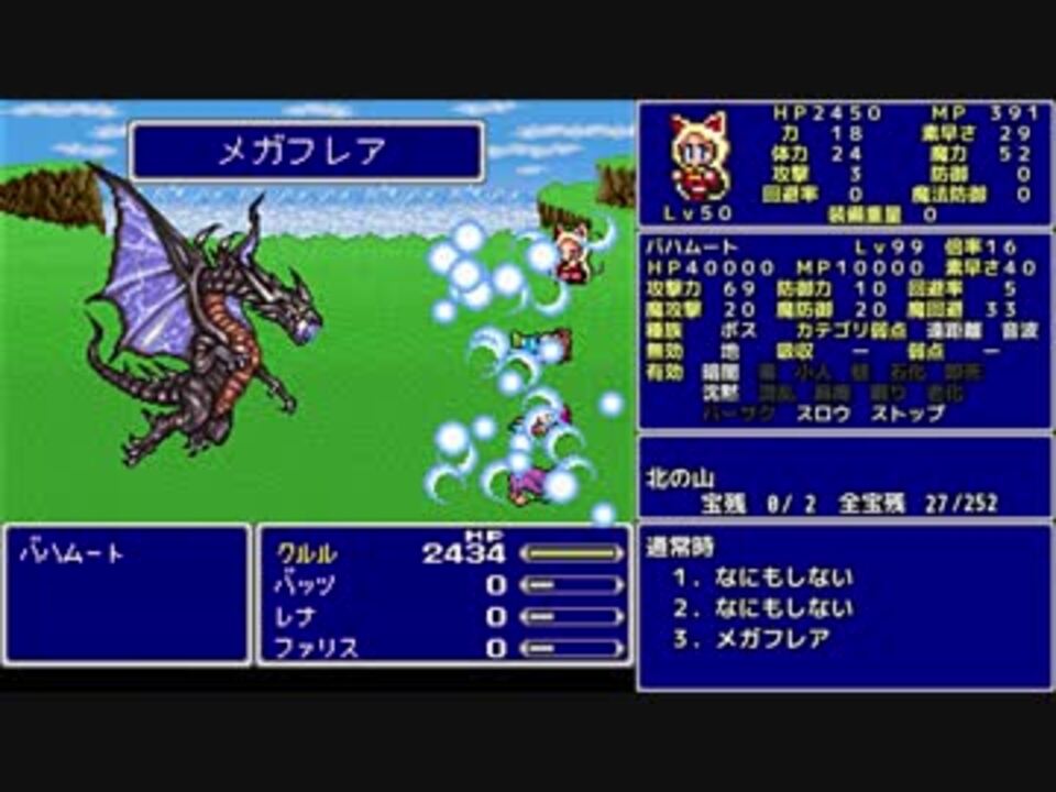 臭い物に蓋をしてきた結果がFF5の冒険である。<br><br>★縛り内容★<br>魔法のみ(白黒時召青)<br>全裸<br>魔法以外の行動不可<br>魔法を使えるジョブのみ<br>アクティブスピード1<br>宝箱回収率100%<br>アイテムの使用は移動中のセーブ可能な場所でのみ<br>勝率0%確定したら最小限のその時だけの解放を考えて続行する<br>ボスを即死等であっさり倒したら使わない戦闘も頑張る<br><br>FF5一覧…<a href="https://www.nicovideo.jp/mylist/56239646" target="_blank" rel="noopener">mylist/56239646</a><br><br>字幕のみPart51…<a href="https://youtu.be/je8IvE9-kgQ" target="_blank" rel="noopener nofollow">https://youtu.be/je8IvE9-kgQ</a><br><br>○前回○ Part50…<a href="https://www.nicovideo.jp/watch/sm33341775" class="watch">sm33341775</a><br>○次回○ Part52…<a href="https://www.nicovideo.jp/watch/sm33449692" class="watch">sm33449692</a><br><br>Youtube版 …<a href="https://youtu.be/JEIocxpVYYM" target="_blank" rel="noopener nofollow">https://youtu.be/JEIocxpVYYM</a><br /><br>ふよふよしているの<br>絵:横沢さわらさん VOICEVOX:WhiteCUL<br><br>【シリーズ】<br>くうねるきゃんぷ … <a href="https://www.nicovideo.jp/series/516069" target="_blank" rel="noopener">series/516069</a><br>お写んぽ! … <a href="https://www.nicovideo.jp/series/435756" target="_blank" rel="noopener">series/435756</a><br>様子がおかしい! … <a href="https://www.nicovideo.jp/series/418875" target="_blank" rel="noopener">series/418875</a><br>FF7 魔法マテリアのみ初期防具ガールズ一人旅ASM … <a href="https://www.nicovideo.jp/series/438696" target="_blank" rel="noopener">series/438696</a><br>きんかつ!V-STROM1050XT … <a href="https://www.nicovideo.jp/series/144466" target="_blank" rel="noopener">series/144466</a><br>FF6 魔法のみ全裸ガールズ一人旅AS1 … <a href="https://www.nicovideo.jp/series/9438" target="_blank" rel="noopener">series/9438</a><br>おバイク!GLADIUS400 ABS … <a href="https://www.nicovideo.jp/series/68579" target="_blank" rel="noopener">series/68579</a><br>FF5 魔法のみ全裸一人旅AS1 … <a href="https://www.nicovideo.jp/series/9432" target="_blank" rel="noopener">series/9432</a><br>DQ3 呪文のみ全裸一人旅 … <a href="https://www.nicovideo.jp/series/9416" target="_blank" rel="noopener">series/9416</a><br>DQ2 ムーンブルクの王女一人旅 … <a href="https://www.nicovideo.jp/series/9414" target="_blank" rel="noopener">series/9414</a><br>DQ1 全裸 … <a href="https://www.nicovideo.jp/series/9412" target="_blank" rel="noopener">series/9412</a><br>FE 紋章の謎 天馬騎士単騎 第2部 英雄戦争 … <a href="https://www.nicovideo.jp/series/9404" target="_blank" rel="noopener">series/9404</a><br>FE 紋章の謎 天馬騎士単騎 第1部 暗黒戦争 … <a href="https://www.nicovideo.jp/series/9401" target="_blank" rel="noopener">series/9401</a><br>聖剣2 全裸プリム一人旅 武器Lv1など … <a href="https://www.nicovideo.jp/series/9396" target="_blank" rel="noopener">series/9396</a><br>ロマサガ2 魔術士不得意武器のみ … <a href="https://www.nicovideo.jp/series/9388" target="_blank" rel="noopener">series/9388</a><br>ロマサガ1 術法のみ一人旅で各イベント攻略 … <a href="https://www.nicovideo.jp/series/9386" target="_blank" rel="noopener">series/9386</a><br><br>SNSとか色々なリンク … <a href="https://lit.link/Unaa" target="_blank" rel="noopener nofollow">https://lit.link/Unaa</a>