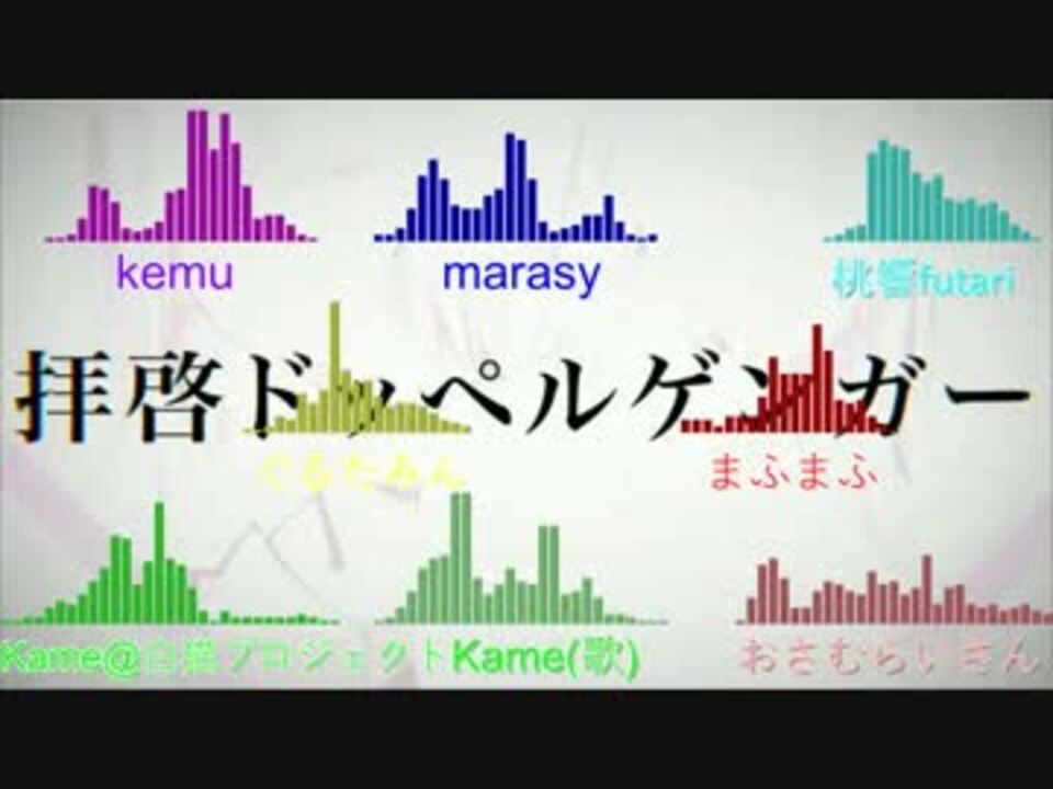 <font color="#9900ff">kemu様(本家)</font> watch/<a href="https://www.nicovideo.jp/watch/sm31445928" class="watch">sm31445928</a><br /> この作品の生みの親=神 その他の作品も神→<a href="https://www.nicovideo.jp/mylist/28584850" target="_blank" rel="noopener">mylist/28584850</a><br /><font color="#ffd966">ぐるたみん様</font><font color="#262626">(歌)</font> watch/<a href="https://www.nicovideo.jp/watch/sm31567883" class="watch">sm31567883</a><br /> 高音のルンパッパァぁぁぁァぁぁが神。アレンジが豊富。最後のルンパッパに関しては鳥肌もの。<br /><font color="#ff0000">まふまふ様</font>(歌) watch/<a href="https://www.nicovideo.jp/watch/sm31334614" class="watch">sm31334614</a><br /> 高音も低音も出せる神。作品中にところどころあるシャウト(ボイス)が印象的。<br /><font color="#00ff00">Kame@白猫プロジェクト様</font>(アカペラ&歌) watch/<a href="https://www.nicovideo.jp/watch/sm33451084" class="watch">sm33451084</a><br /> ボイパも本家さながらの音取りの正確さも神。動画最初と間奏部分で聞こえるドラム音はすべて彼のボイパ。<br /><font color="#0000ff">marasy様</font>(ピアノ) watch/<a href="https://www.nicovideo.jp/watch/sm31411233" class="watch">sm31411233</a><br /> 人間離れの速さについて行ける10本の神の指たち。もはや残像。ピンクのおさるさんがトレンドマーク<br /><font color="#e06666">おさむらいさん様</font>(アコースティックギター) watch/<a href="https://www.nicovideo.jp/watch/sm31362850" class="watch">sm31362850</a><br /> ご本人様もわかっていらっしゃる、アコースティックギターで弾く曲ではないと...でも弾けてしまっているところが神<br /><font color="#00ffff">桃響futari様</font>(津軽三味線) watch/<a href="https://www.nicovideo.jp/watch/sm31314079" class="watch">sm31314079</a><br /> そもそもこの曲を弾こうと思ったこと自体が神。和楽器でもここまで早く引けるのか!と思わされる一作。<br /><br />*ぐるたみん様と、まふまふ様の歌声だけを抽出しようと試みたのですが、あまりうまくはいきませんでした。Kame@白猫プロジェクト様の声は綺麗に抽出できましたが、時間が非常にかかりました.... <br />