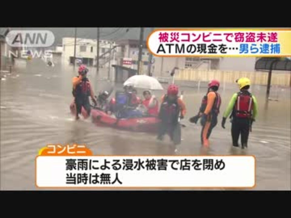 窃盗未遂や建造物侵入の疑いで逮捕された岡山県倉敷市の建設業・杉本一史容疑者(22)と19歳の少年2人は、7月9日午前11時半から10日午前4時ごろまでの間に岡山県高梁市のコンビニに侵入し、店にあったATMをこじ開けて現金を盗もうとした疑いです。このコンビニは豪雨による浸水被害で店を閉めていて、当時は無人でした。警備会社からの110番通報で事件が発覚したもので、調べに対して少年2人は容疑を認め、杉本容疑者は「事実と違う」と否認しています。<br />関連<br /><b>支援物資の送り方は?ボランティア募集始まる</b><a href="https://www.nicovideo.jp/watch/sm33500479" class="watch">sm33500479</a><br /><b>広島県警「被災地デマ注意」</b><a href="https://www.nicovideo.jp/watch/sm33502807" class="watch">sm33502807</a><br />【ドラえもん募金】西日本豪雨災害被災者支援<a href="https://www.nicovideo.jp/watch/sm33507877" class="watch">sm33507877</a><br />依然8人の安否が不明 自衛隊など221人態勢捜索<a href="https://www.nicovideo.jp/watch/sm33507960" class="watch">sm33507960</a><br />バックウォーター現象で被害拡大?<a href="https://www.nicovideo.jp/watch/sm33507941" class="watch">sm33507941</a><br />広島・榎川で新たに氾濫<a href="https://www.nicovideo.jp/watch/sm33507695" class="watch">sm33507695</a><br />「起こるべくして起こった」堤防決壊 小田川と高馬川氾濫<a href="https://www.nicovideo.jp/watch/sm33505176" class="watch">sm33505176</a><br />真備町の洪水被害は「バックウォーター」が原因か <a href="https://www.nicovideo.jp/watch/sm33494444" class="watch">sm33494444</a><br />コンビニ営業停止、マツダやパナソニック操業停止<a href="https://www.nicovideo.jp/watch/sm33502955" class="watch">sm33502955</a><br />避難生活に不安の声<a href="https://www.nicovideo.jp/watch/sm33502728" class="watch">sm33502728</a><br />肱川氾濫で濁流溢れ2階部分まで 野村高校の野球部員も片づけに<a href="https://www.nicovideo.jp/watch/sm33501047" class="watch">sm33501047</a><br />岩国市獺越地区 日本酒「獺祭」メーカーも被害<a href="https://www.nicovideo.jp/watch/sm33501007" class="watch">sm33501007</a><br />安芸区梅河団地倒壊<a href="https://www.nicovideo.jp/watch/sm33497793" class="watch">sm33497793</a><br />