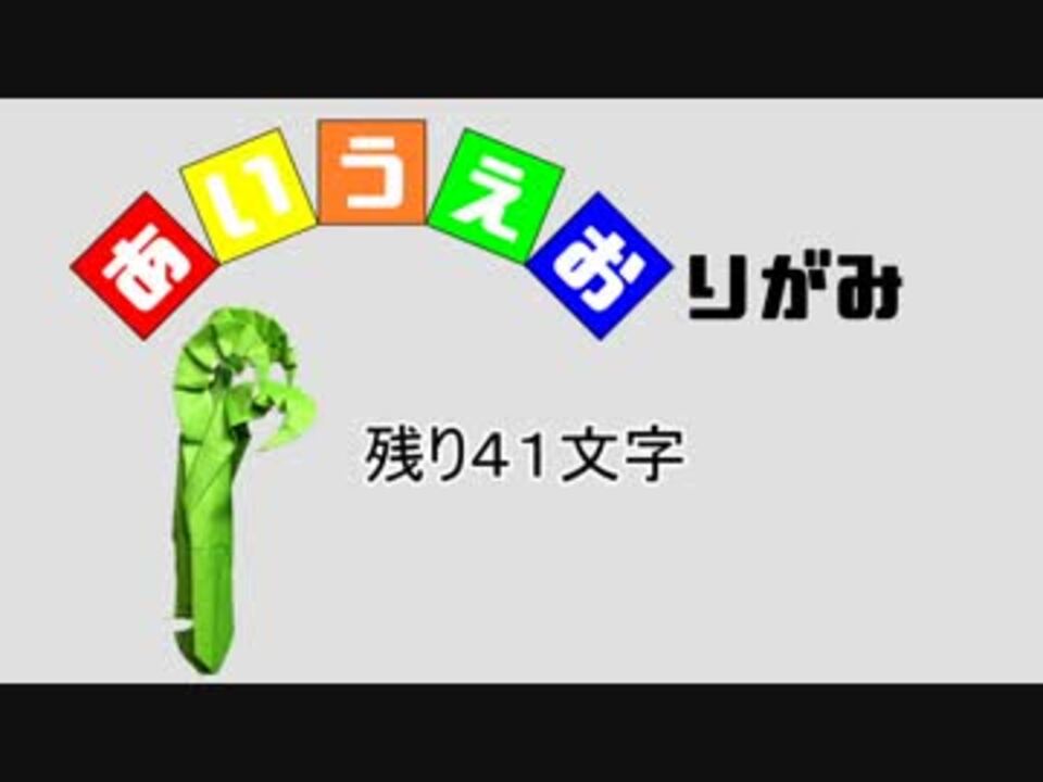 一回でできるとは限りません<br />次回放送は未定<br />ニコ生コミュ にて<br /><a href="https://com.nicovideo.jp/community/co3677141" target="_blank" rel="noopener nofollow">https://com.nicovideo.jp/community/co3677141</a><br />前 <a href="https://www.nicovideo.jp/watch/sm33464397" class="watch">sm33464397</a><br />マイリスト <a href="https://www.nicovideo.jp/mylist/62371000" target="_blank" rel="noopener">mylist/62371000</a> <br />あいうえおりがみとは<br />1.生放送のコメントで50音からひとつ選んでもらいます(今まで選ばれてないもの、濁音、半濁音は含みません)。<br />2.選ばれた一文字が頭文字のものを題材に即興で創作(折り方を考える)を行います。<br />3.これで50音を制覇します。<br /><br />例<br />コメントにより「て」が選ばれる→私が「手首」を即興で創作→<br />これをあと50回繰り返す。<br /><br /><font size="2">ホームページ:<a href="http://gokitannlove.wixsite.com/hyperesthesia/blank-50" target="_blank" rel="noopener nofollow">http://gokitannlove.wixsite.com/hyperesthesia/blank-50</a></font><font size="2"><br />創作者:ハイパーステジア</font><font size="2"><br />twitter:@Hyperesthesia_o<br />ブログ:<a href="http://www.hyperesthesia-origami.website/" target="_blank" rel="noopener nofollow">http://www.hyperesthesia-origami.website/</a><br /><br />動画編集ソフト:aviutl</font><br /><font size="2">BGM1:</font>はりきっちゃう時のテーマ<font size="2"><br />作曲者:こおろぎ</font><br /><font size="2">BGM2:クレイジークッキング</font><font size="2"><br />作曲者:稿屋 隆</font>