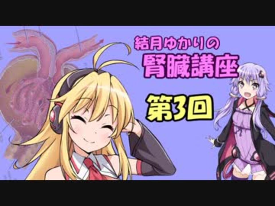 <font size="5"><b>第3回後編 腎臓と内分泌</b></font><br>どうも、第3回です。今回で腎臓の正常についての最終回です。(予定)<br>腎臓病編は長くなりそう。<br><br>次回予告が気になった場合には「マイナスターズ」「じゃらら」で検索してください。<br><br><font size="3"><font color="#cc0000">注意事項</font><br>①この動画の目的は腎臓の魅力を伝えることです。健康法や治療法などの効能効果を示すものではありません。 心配なことは主治医や専門医に聞いてください。<br>②間違っている内容や既に古い知見となった内容もあるかもしれません。看護学生や医学生が鵜呑みにすると危険です。 <br>③特に笑いはありません。くそ真面目な内容です。</font><br><br>youtubeチャネル:<a href="https://www.youtube.com/channel/UCyyTGpk9WMpKZiJMlmu9gWg" target="_blank" rel="noopener nofollow">https://www.youtube.com/channel/UCyyTGpk9WMpKZiJMlmu9gWg</a> <br>結月ゆかりの腎臓講座 第2回後編(前回):<a href="https://www.nicovideo.jp/watch/sm33486936" class="watch">sm33486936</a>、次回(第4回):<a href="https://www.nicovideo.jp/watch/sm33630181" class="watch">sm33630181</a><br>シリーズマイリスト【 <a href="https://www.nicovideo.jp/mylist/62588759" target="_blank" rel="noopener">mylist/62588759</a> 】 <br><font color="#222222">結月ゆかりの医療用語講座 </font><a href="https://www.nicovideo.jp/watch/sm33309178" class="watch">sm33309178</a> <br><br>使用したもの<br>Aviutl, nicotalk3z, VOICEROID+ 結月ゆかりEX, VOICEROID+ 民安ともえEX<br>立ち絵:たしかなまんぞく様 <br>参考文献:標準腎臓病学、腎生検病理アトラス改訂版、Silva's diagnostic renal pathology、エビデンスに基づくCKD診療ガイドライン2018、CKD診療ガイド2012、腎臓内科クリニカルスタンダード、臨床腎臓病マニュアル、レジデントのための腎臓病診療マニュアル、腎臓病診療レジデントマニュアル 他