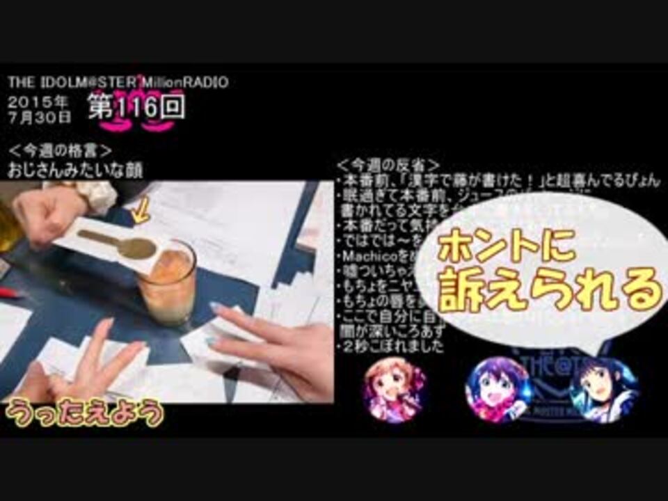 2015年でもぴょんの思春期が爆発してたミリラジ第116回の単発まとめです。いい意味でぴょんころもちは変わらないですね。<br />暑い日が続きますので、息抜きにでもどうぞ。<br /><br />もしよろしければこちらもどうぞ<br />【ミリラジ単発まとめ】(~2015)<br />・第0回 すんごいパイロット回→ <a href="https://www.nicovideo.jp/watch/sm32152775" class="watch">sm32152775</a><br />・第108/109回 古風と目覚まし→ <a href="https://www.nicovideo.jp/watch/sm32464958" class="watch">sm32464958</a><br />・第110/112/113回 つっこみ不在(今更)→ <a href="https://www.nicovideo.jp/watch/sm32521830" class="watch">sm32521830</a><br />・第114/115回 西武と10th→ <a href="https://www.nicovideo.jp/watch/sm32580647" class="watch">sm32580647</a><br />・第117/118回 DJと曲紹介と…→ <a href="https://www.nicovideo.jp/watch/sm32399637" class="watch">sm32399637</a><br />・第119/120回 感想文とC&c→ <a href="https://www.nicovideo.jp/watch/sm32388746" class="watch">sm32388746</a><br />・第121/122回 うそと説明力→ <a href="https://www.nicovideo.jp/watch/sm32502760" class="watch">sm32502760</a><br />・第123/124回 もちょっちょとSP→ <a href="https://www.nicovideo.jp/watch/sm32995635" class="watch">sm32995635</a><br />・第125/126回 おこもちょと本→ <a href="https://www.nicovideo.jp/watch/sm32618276" class="watch">sm32618276</a><br />・第127/128回 腕相撲ともちょろい→ <a href="https://www.nicovideo.jp/watch/sm32789631" class="watch">sm32789631</a><br />・第129回 ハロウィン回@ぴらみさん→ <a href="https://www.nicovideo.jp/watch/sm32278696" class="watch">sm32278696</a><br />・第131回 ディベート→ <a href="https://www.nicovideo.jp/watch/sm32970224" class="watch">sm32970224</a><br />・第132/133/134回 のむらとお風呂と漢字→ <a href="https://www.nicovideo.jp/watch/sm32658666" class="watch">sm32658666</a><br /><br />その他ミリオン関連動画→<a href="https://www.nicovideo.jp/mylist/59676609" target="_blank" rel="noopener">mylist/59676609</a>