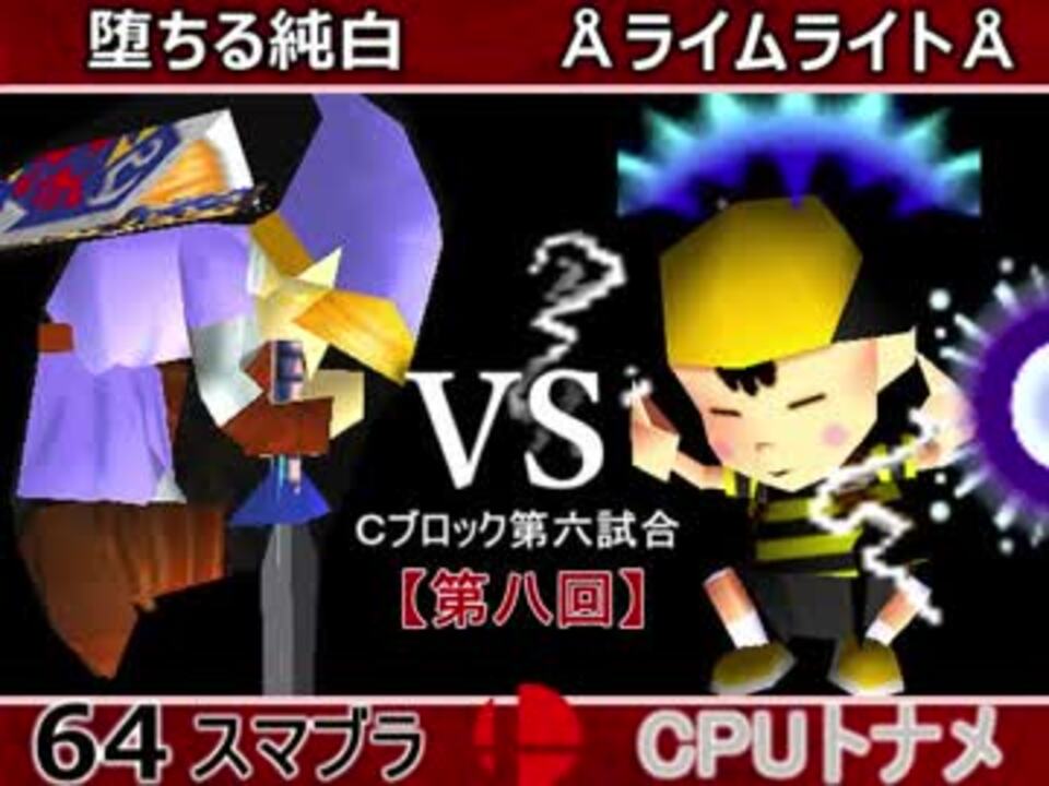 読めない組み合わせ!<br />※どちらが勝つかアンケ結果(Twitter調べ) <br />堕ちる純白(LI) 52% VS ÅライムライトÅ(NE) 48%<br /><br /><font color="#0000ff"><u>※64スマブラCPUトナメ実況のwikiができた模様</u>→</font> <a href="https://wiki3.jp/cpu_64" target="_blank" rel="noopener nofollow">https://wiki3.jp/cpu_64</a><br /><br /><b><font size="5"><font color="#ff0000">次→</font></font></b>【<a href="https://www.nicovideo.jp/watch/sm33578278" class="watch">sm33578278</a>】※毎日投稿<br /><br />前【<a href="https://www.nicovideo.jp/watch/sm33573666" class="watch">sm33573666</a>】 Cブロック第一試合 【<a href="https://www.nicovideo.jp/watch/sm33474964" class="watch">sm33474964</a> 】 <br />Aブロック第一試合【<a href="https://www.nicovideo.jp/watch/sm33462799" class="watch">sm33462799</a>】 <br />出場選手紹介【<a href="https://www.nicovideo.jp/watch/sm33435891" class="watch">sm33435891</a>】<br /> <br />第八回マイリスト【<a href="https://www.nicovideo.jp/mylist/62486112" target="_blank" rel="noopener">mylist/62486112</a>】 <br />64スマブラCPUトナメ実況part1まとめ【<a href="https://www.nicovideo.jp/mylist/60846861" target="_blank" rel="noopener">mylist/60846861</a>】<br />その他シリーズ【<a href="https://www.nicovideo.jp/mylist/12965027" target="_blank" rel="noopener">mylist/12965027</a>】<br /><br /><b><font color="#00bfff">Twitter</font></b>【<a href="https://twitter.com/niconicopppppp】" target="_blank" rel="noopener nofollow">https://twitter.com/niconicopppppp】</a><br /><b><font color="#ff4500">チャンネル</font></b>【<a href="https://ch.nicovideo.jp/p-desu" target="_blank" rel="noopener">ch.nicovideo.jp/p-desu</a>】