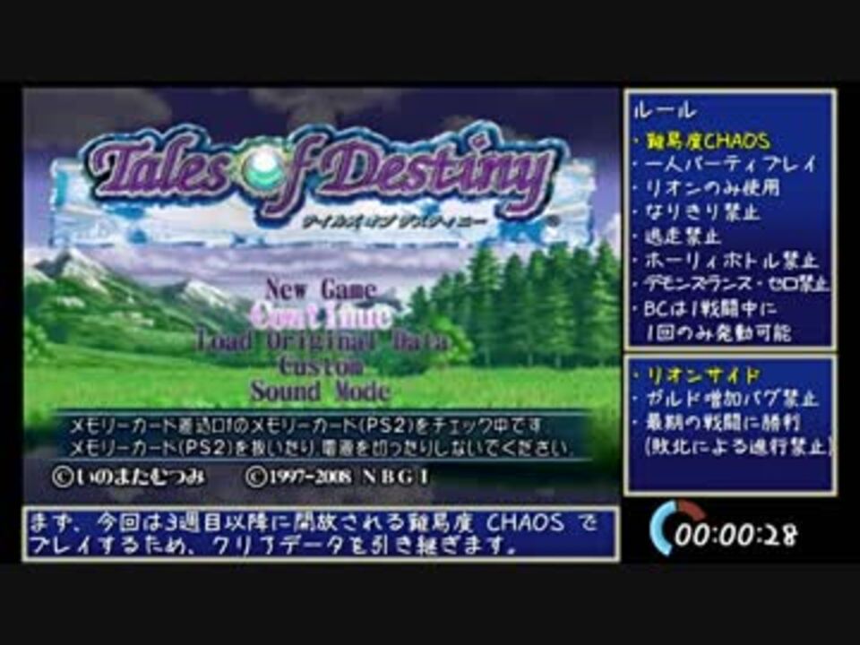 テイルズオブデスティニーDC(リオンサイド)の縛りRTAです。<br>「ゲームスタート~ストレイライズの森まで」<br><br>RTA初投稿です。<br>RPGのRTAでは珍しく、道中の戦闘も全てこなします。<br>Part1は解説回。すんごいしゃべるよ!<br><br>Part1 ここ | Part2 <a href="https://www.nicovideo.jp/watch/sm35240628" class="watch">sm35240628</a><br>youtube→【 <a href="https://youtu.be/B_bSCkSfn_0" target="_blank" rel="noopener nofollow">https://youtu.be/B_bSCkSfn_0</a> 】<br>Twitter→【 <a href="https://twitter.com/Excdys" target="_blank" rel="noopener nofollow">https://twitter.com/Excdys</a> 】<br><br>皆様、たくさんの広告ありがとうございます!<br><br>計測開始:PS2のリセットボタンを押す<br>計測終了:クリアデータセーブ画面表示<br><br>ルール:<br>難易度CHAOS/一人パーティプレイ/リオンのみ使用/<br>なりきり、逃走、ホーリィボトル、デモンズランス・ゼロ禁止/<br>BCは1戦闘中1回のみ発動可/ガルド増加バグ禁止/<br>最期の戦闘に勝利(敗北による進行禁止)