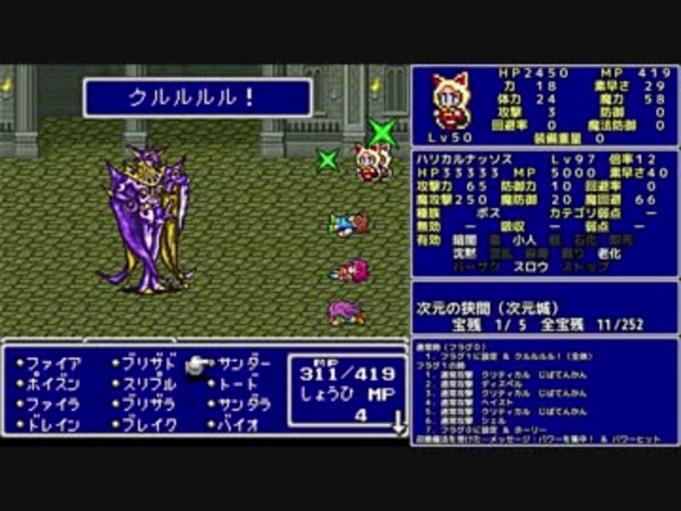おのーれおのれ! 待っていたぞ、科学忍者隊!<br>・雌雄同体 ・女装 ・IQ280(魔法攻撃力250) <br>・科学忍法火の鳥(召喚にカウンター@フェニックス)<br><br>★縛り内容★<br>魔法のみ(白黒時召青)<br>全裸<br>魔法以外の行動不可<br>魔法を使えるジョブのみ<br>アクティブスピード1<br>宝箱回収率100%<br>アイテムの使用は移動中のセーブ可能な場所でのみ<br>勝率0%確定したら最小限のその時だけの解放を考えて続行する<br>ボスを即死等であっさり倒したら使わない戦闘も頑張る<br><br>FF5一覧…<a href="https://www.nicovideo.jp/mylist/56239646" target="_blank" rel="noopener">mylist/56239646</a><br><br>字幕のみPart57…<a href="https://youtu.be/4HeGHwWufhw" target="_blank" rel="noopener nofollow">https://youtu.be/4HeGHwWufhw</a><br><br>○前回○ Part56…<a href="https://www.nicovideo.jp/watch/sm33570893" class="watch">sm33570893</a><br>○次回○ Part58…<a href="https://www.nicovideo.jp/watch/sm33589529" class="watch">sm33589529</a><br><br>Youtube版 …<a href="https://youtu.be/0iIJPiMy7jA" target="_blank" rel="noopener nofollow">https://youtu.be/0iIJPiMy7jA</a><br /><br>ふよふよしているの<br>絵:横沢さわらさん VOICEVOX:WhiteCUL<br><br>【シリーズ】<br>くうねるきゃんぷ … <a href="https://www.nicovideo.jp/series/516069" target="_blank" rel="noopener">series/516069</a><br>お写んぽ! … <a href="https://www.nicovideo.jp/series/435756" target="_blank" rel="noopener">series/435756</a><br>様子がおかしい! … <a href="https://www.nicovideo.jp/series/418875" target="_blank" rel="noopener">series/418875</a><br>FF7 魔法マテリアのみ初期防具ガールズ一人旅ASM … <a href="https://www.nicovideo.jp/series/438696" target="_blank" rel="noopener">series/438696</a><br>きんかつ!V-STROM1050XT … <a href="https://www.nicovideo.jp/series/144466" target="_blank" rel="noopener">series/144466</a><br>FF6 魔法のみ全裸ガールズ一人旅AS1 … <a href="https://www.nicovideo.jp/series/9438" target="_blank" rel="noopener">series/9438</a><br>おバイク!GLADIUS400 ABS … <a href="https://www.nicovideo.jp/series/68579" target="_blank" rel="noopener">series/68579</a><br>FF5 魔法のみ全裸一人旅AS1 … <a href="https://www.nicovideo.jp/series/9432" target="_blank" rel="noopener">series/9432</a><br>DQ3 呪文のみ全裸一人旅 … <a href="https://www.nicovideo.jp/series/9416" target="_blank" rel="noopener">series/9416</a><br>DQ2 ムーンブルクの王女一人旅 … <a href="https://www.nicovideo.jp/series/9414" target="_blank" rel="noopener">series/9414</a><br>DQ1 全裸 … <a href="https://www.nicovideo.jp/series/9412" target="_blank" rel="noopener">series/9412</a><br>FE 紋章の謎 天馬騎士単騎 第2部 英雄戦争 … <a href="https://www.nicovideo.jp/series/9404" target="_blank" rel="noopener">series/9404</a><br>FE 紋章の謎 天馬騎士単騎 第1部 暗黒戦争 … <a href="https://www.nicovideo.jp/series/9401" target="_blank" rel="noopener">series/9401</a><br>聖剣2 全裸プリム一人旅 武器Lv1など … <a href="https://www.nicovideo.jp/series/9396" target="_blank" rel="noopener">series/9396</a><br>ロマサガ2 魔術士不得意武器のみ … <a href="https://www.nicovideo.jp/series/9388" target="_blank" rel="noopener">series/9388</a><br>ロマサガ1 術法のみ一人旅で各イベント攻略 … <a href="https://www.nicovideo.jp/series/9386" target="_blank" rel="noopener">series/9386</a><br><br>SNSとか色々なリンク … <a href="https://lit.link/Unaa" target="_blank" rel="noopener nofollow">https://lit.link/Unaa</a>
