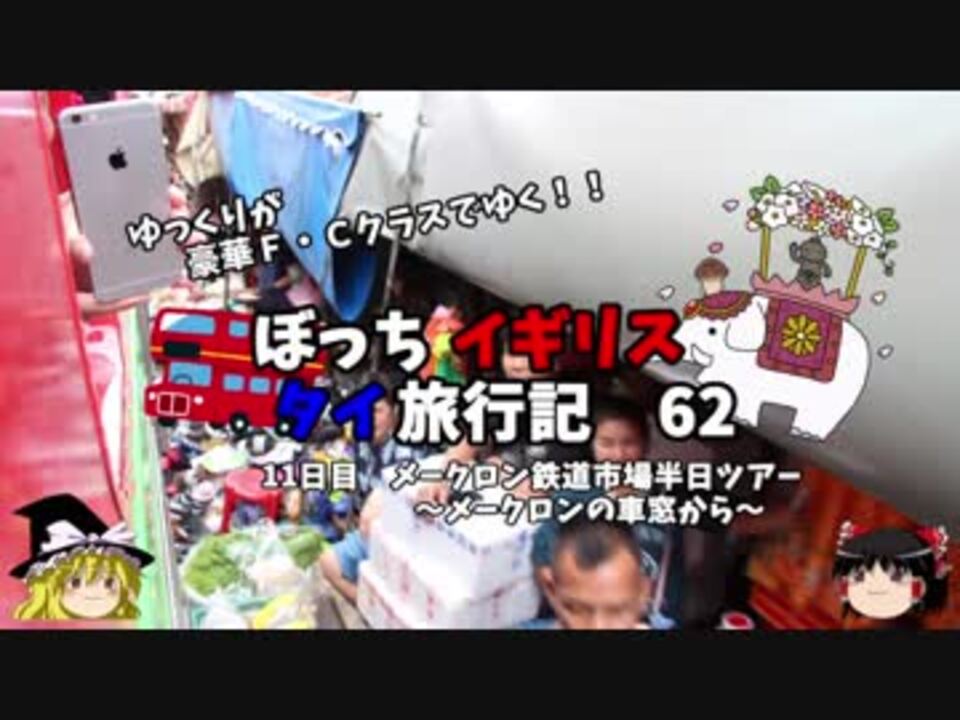 <font color="#ff0000" size="4"><u>※Youtubeで1話分、先行配信中 </u></font><br /><font color="#0000ff" size="4"> <a href="http://www.youtube.com/c/なめこのぼっち旅" target="_blank" rel="noopener nofollow">http://www.youtube.com/c/なめこのぼっち旅</a></font> <br /><br /><b> </b>今回のツアーのメインイベント、列車に乗り込み市場を駆け抜けましょう!<br />車両最後方からの映像は良かった・・・<br />列車が通り過ぎた直後に屋根を戻してました!<br /><br />第一話→<a href="https://www.nicovideo.jp/watch/sm32025927" class="watch">sm32025927</a><br /><br />第1章・・・東京編<br /> 第2章・・・出発編<br /> 第3章・・・イギリス編<br /> 第4章・・・移動編<br />第5章・・・タイ編<font color="#ff0000">←今ココ</font><br /> 第6章・・・帰路編<br /><br /><font color="#ff0000">コミュニティー→co2910020</font><br /> twitter→<a href="https://twitter.com/ryontan" target="_blank" rel="noopener nofollow">https://twitter.com/ryontan</a><br /><br /><a href="https://www.nicovideo.jp/watch/sm33565994" class="watch">sm33565994</a>←前回 <font color="#ff0000">次回 63話→<a href="https://www.nicovideo.jp/watch/sm33620134" class="watch">sm33620134</a></font><br /><br />今作 イギリスタイ旅行記→<a href="https://www.nicovideo.jp/mylist/60044833" target="_blank" rel="noopener">mylist/60044833</a><br />今作 車中泊旅行記→<a href="https://www.nicovideo.jp/mylist/54706524" target="_blank" rel="noopener">mylist/54706524</a><br />前作 クルーズ旅行記→<a href="https://www.nicovideo.jp/mylist/57397685" target="_blank" rel="noopener">mylist/57397685</a><br />第5弾 ドイツ周遊記→<a href="https://www.nicovideo.jp/mylist/54938346" target="_blank" rel="noopener">mylist/54938346</a><br />第4弾 北海道旅行記→<a href="https://www.nicovideo.jp/mylist/52618057" target="_blank" rel="noopener">mylist/52618057</a><br />第3弾 アメリカ横断記→<a href="https://www.nicovideo.jp/mylist/48621785" target="_blank" rel="noopener">mylist/48621785</a><br />第2弾 イタリア周遊記→<a href="https://www.nicovideo.jp/mylist/45763559" target="_blank" rel="noopener">mylist/45763559</a><br />第1弾 NY旅行記→<a href="https://www.nicovideo.jp/mylist/44343854" target="_blank" rel="noopener">mylist/44343854</a><font color="#ff0000" size="5"><font color="#000000" size="2"><br /></font></font>