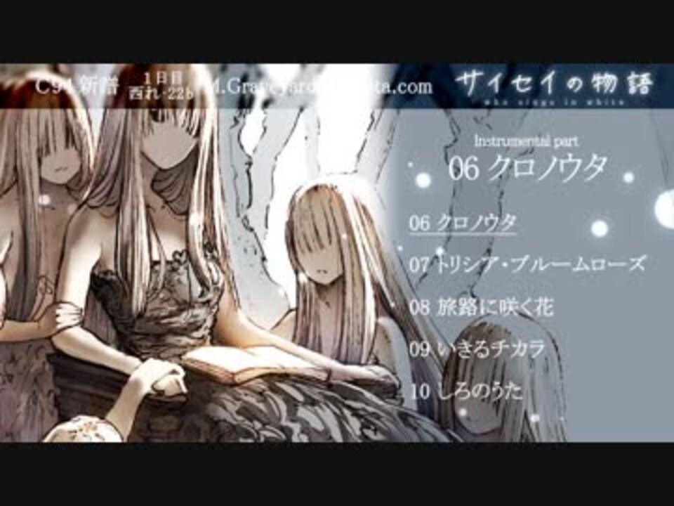 「あるところに真っ白な少女がいましたー<br />これは そんな彼女がなにかを残しナニカを取り戻す物語。」<br /><br />M.Graveyard×7uta.comが手掛ける、「ひぐらしのなく頃に」「うみねこのなく頃に」の代表曲が収録されたCD『ずっと、ふたり。』に続く、オリジナルCD第二弾。優しくも儚い世界へが詰まったサイセイの物語。<br /><font color="#333333"><br /><br />◇Info<br /></font>「サイセイの物語 -who sings in white-」<br />dai×nayutaが贈るオリジナルファンタジーアルバム。<br />(全10曲収録)<br /><br />特設サイト:<a href="http://mgraveyard.com/saisei/" target="_blank" rel="noopener nofollow">http://mgraveyard.com/saisei/</a> <br /><br /><font color="#14171a">コミックマーケット94 1日目<br />8/10(金)西 れ-22b "7uta.com" にて頒布します!</font> <br /><br /><font color="#333333">◇Staff</font><br />Music:dai(M.Graveyard)<a href="http://mgraveyard.com/" target="_blank" rel="noopener nofollow">http://mgraveyard.com/</a><br />Vocal:nayuta(7uta.com)<a href="http://www.7uta.com/" target="_blank" rel="noopener nofollow">http://www.7uta.com/</a><br />Lyrics:ちだい<br />Mixing&Mastering:神尾けい <a href="https://twitter.com/chaos0bit" target="_blank" rel="noopener nofollow">https://twitter.com/chaos0bit</a><br />Illustration&Design:myu.(7uta.com)<br />Movie:Cross <br /><font color="#333333"><br />*Vocal part:</font><a href="https://www.nicovideo.jp/watch/sm33594245" class="watch">sm33594245</a>