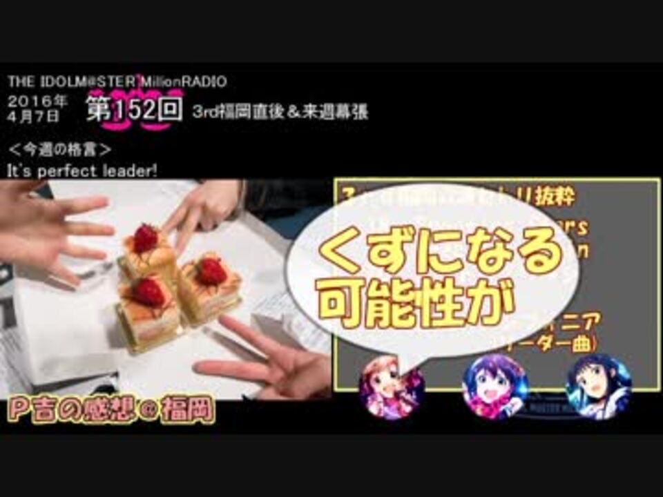3rdライブ福岡公演直後でライブについてアレコレ話してるミリラジ第152回の単発まとめです。ころもちの言葉のチョイス、相変わらず面白いですね。<br /><br />もしよろしければこちらもどうぞ<br />【ミリラジ単発まとめ】<br />・第139/140回 あの田所さん→ <a href="https://www.nicovideo.jp/watch/sm33385338" class="watch">sm33385338</a><br />・第141回 fruity love回@あつひめ&ちゃきさん→ <a href="https://www.nicovideo.jp/watch/sm32158551" class="watch">sm32158551</a><br />・第142回 ホリプロ回@こちま&いぶいぶ→ <a href="https://www.nicovideo.jp/watch/sm32045626" class="watch">sm32045626</a><br />・第143回 なんす&ぽぽちゃん→ <a href="https://www.nicovideo.jp/watch/sm31929825" class="watch">sm31929825</a><br />・第144/146回 せーの係と親知らず→ <a href="https://www.nicovideo.jp/watch/sm33070616" class="watch">sm33070616</a><br />・第145/147回 犬の気持ちと女の子らしさ→ <a href="https://www.nicovideo.jp/watch/sm32478196" class="watch">sm32478196</a><br />・第148回 濃厚回@ゆき姉&あっしゅ→ <a href="https://www.nicovideo.jp/watch/sm32008248" class="watch">sm32008248</a><br />・第150/154回 なーな&こちま回→ <a href="https://www.nicovideo.jp/watch/sm32347552" class="watch">sm32347552</a><br />・第151回 天&でんでん回→ <a href="https://www.nicovideo.jp/watch/sm32029040" class="watch">sm32029040</a><br />・第153回 たかみな&あべりか回→ <a href="https://www.nicovideo.jp/watch/sm31995928" class="watch">sm31995928</a><br />・第155/156回 狙われたうどんとぱぽー→ <a href="https://www.nicovideo.jp/watch/sm32532379" class="watch">sm32532379</a><br />・第157/158回 種と星→ <a href="https://www.nicovideo.jp/watch/sm32595630" class="watch">sm32595630</a><br /><br />その他ミリオン関連動画→<a href="https://www.nicovideo.jp/mylist/59676609" target="_blank" rel="noopener">mylist/59676609</a><br />