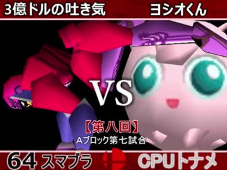 今度はパンチ避けられる?? <br />※どちらが勝つかアンケ結果(Twitter調べ) <br />3億ドルの吐き気(FA) 75% VS ヨシオくん(PU) 25%<br /><br /><font color="#0000ff"><u>※64スマブラCPUトナメ実況のwikiができた模様</u>→</font> <a href="https://wiki3.jp/cpu_64" target="_blank" rel="noopener nofollow">https://wiki3.jp/cpu_64</a><br /><br /><b><font size="5"><font color="#ff0000">次→</font></font></b>【<a href="https://www.nicovideo.jp/watch/sm33608376" class="watch">sm33608376</a>】※毎日投稿<font color="#ff0000"><u><br /></u></font><br />前【<a href="https://www.nicovideo.jp/watch/sm33587486" class="watch">sm33587486</a>】 Aブロック第一試合【<a href="https://www.nicovideo.jp/watch/sm33462799" class="watch">sm33462799</a>】 <br />出場選手紹介【<a href="https://www.nicovideo.jp/watch/sm33435891" class="watch">sm33435891</a>】<br /> <br />第八回マイリスト【<a href="https://www.nicovideo.jp/mylist/62486112" target="_blank" rel="noopener">mylist/62486112</a>】 <br />64スマブラCPUトナメ実況part1まとめ【<a href="https://www.nicovideo.jp/mylist/60846861" target="_blank" rel="noopener">mylist/60846861</a>】<br />その他シリーズ【<a href="https://www.nicovideo.jp/mylist/12965027" target="_blank" rel="noopener">mylist/12965027</a>】<br /><br /><b><font color="#00bfff">Twitter</font></b>【<a href="https://twitter.com/niconicopppppp】" target="_blank" rel="noopener nofollow">https://twitter.com/niconicopppppp】</a><br /><b><font color="#ff4500">チャンネル</font></b>【<a href="https://ch.nicovideo.jp/p-desu" target="_blank" rel="noopener">ch.nicovideo.jp/p-desu</a>】