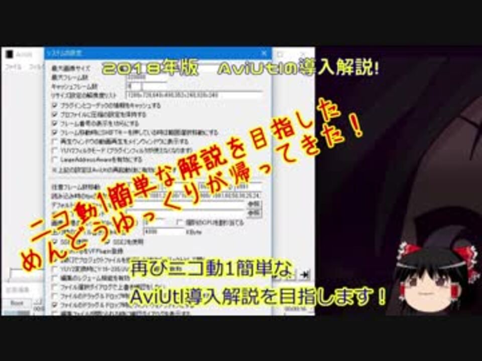 <strong>「【2025年版】世界一簡単なAviUtl導入解説+x264guiExの簡単な使い方&おすすめプラグイン紹介【VOICEVOX解説】」を投稿しました。こちらが最新版になります。最新版の視聴をお勧めします。<br><u>watch/<a href="https://www.nicovideo.jp/watch/sm44489261" class="watch">sm44489261</a></u></strong><br><br>AviUtl を「ニコニコ動画 1」簡単に導入しよう! というフラグを立てた動画です。<br><br>URL<br>① <u><a href="http://spring-fragrance.mints.ne.jp/aviutl/" target="_blank" rel="noopener nofollow">http://spring-fragrance.mints.ne.jp/aviutl/</a></u><br>② <u><a href="https://rigaya34589.blog.fc2.com/?cat=5&page=0" target="_blank" rel="noopener nofollow">https://rigaya34589.blog.fc2.com/?cat=5&page=0</a></u><br>③ <u><a href="http://pop.4-bit.jp/?page_id=7929" target="_blank" rel="noopener nofollow">http://pop.4-bit.jp/?page_id=7929</a></u><br>④ <u><a href="http://aoytsk.blog.jp/Aviutl/613302.html" target="_blank" rel="noopener nofollow">http://aoytsk.blog.jp/Aviutl/613302.html</a></u><br>⑤ <u><a href="https://drive.google.com/drive/folders/0BzuaozbBLsmHN05IcE9UUWliYWs?resourcekey=0-dN2No_tfEEzDFPg66B_vqA" target="_blank" rel="noopener nofollow">https://drive.google.com/drive/folders/0BzuaozbBLsmHN05IcE9UUWliYWs?resourcekey=0-dN2No_tfEEzDFPg66B_vqA</a></u><br><br>LuaJITのDLLを使うと とても動作が速くなるのでおすすめです!<br>・Release Latest · Per-Terra/LuaJIT-Auto-Builds · GitHub<br> <u><a href="https://github.com/Per-Terra/LuaJIT-Auto-Builds/releases/latest" target="_blank" rel="noopener nofollow">https://github.com/Per-Terra/LuaJIT-Auto-Builds/releases/latest</a></u><br><br>Visual C++ 2015 再頒布可能パッケージ<br><u><a href="https://www.microsoft.com/ja-jp/download/details.aspx?id=52685" target="_blank" rel="noopener nofollow">https://www.microsoft.com/ja-jp/download/details.aspx?id=52685</a></u><br><br>x264guiEx 手動導入の方法 - AviUtl 初心者wiki<br><u><a href="http://aviutl-beginner.memo.wiki/d/x264guiEx%20%bc%ea%c6%b0%c6%b3%c6%fe%a4%ce%ca%fd%cb%a1" target="_blank" rel="noopener nofollow">http://aviutl-beginner.memo.wiki/d/x264guiEx%20%bc%ea%c6%b0%c6%b3%c6%fe%a4%ce%ca%fd%cb%a1</a></u><br><br>ゆっくり実況プレイ作ってみようシリーズ:<a href="https://www.nicovideo.jp/mylist/59062601" target="_blank" rel="noopener">mylist/59062601</a><br>YouTube版: <u><a href="https://youtu.be/LCAJzhQ2rho" target="_blank" rel="noopener nofollow">https://youtu.be/LCAJzhQ2rho</a></u><br><br />質問・ご指摘はmenndouyukkuri@yahoo.co.jpまでお願いします。<br>Twitter:<u><a href="https://twitter.com/Kurumi_Kyoden" target="_blank" rel="noopener nofollow">https://twitter.com/Kurumi_Kyoden</a></u><br>めんどうゆっくりのほしいものリスト:<u><a href="https://amzn.asia/6PKzpwZ" target="_blank" rel="noopener nofollow">https://amzn.asia/6PKzpwZ</a></u>