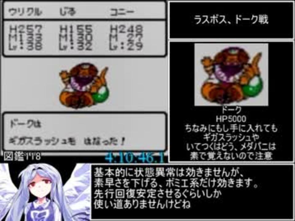 <span style="color: #333333;">モンスター集め~ドーク撃破~モンスター集めまで</span><br><br>最終メンバー落選したけど惜しかったモンスター紹介<br>候補9、デスファレーナくん<br>長所:ギガスラッシュ、メダパニ完全耐性。レベルアップが速く、総合能力もいい<br>落選理由: ギガスラッシュ、メダパニを完全に対策したモンスターには、AIの仕様上とんでいかない。つまりグリズリーくんにとぶ危険が増える。ある程度とんできた方が、かばう意味で逆に安定する。耐性あればいいってもんじゃな-い。<br><br>候補10、ヘルコンドルくん<br>長所:ギガスラッシュ強耐性、メダパニ弱耐性、ベホマラーもち。<br>落選理由:ドークまではいいものの、そのあとが苦しい。理論上はクリア出来るが全く安定しない。<br><br><a href="https://www.nicovideo.jp/watch/sm33615679" class="watch">sm33615679</a>←前 次→<a href="https://www.nicovideo.jp/watch/sm33647056" class="watch">sm33647056</a><br><br><span style="color: #333333;">この動画のマイリス《</span><a href="https://www.nicovideo.jp/mylist/62624075" target="_blank" rel="noopener">mylist/62624075</a><span style="color: #333333;">》<br>今まで作ったの《</span><a href="https://www.nicovideo.jp/mylist/57577783" target="_blank" rel="noopener">mylist/57577783</a><span style="color: #333333;">》<br>《追記》<br>城の宝物庫にて、ふしぎなかぎ×ふしぎなベルト〇<br><br>Q.ひとつめピエロ2回目について、肉あげてなくない?<br>A.あ、そうですね…勘違い。やだ聡ずかしい…</span><br><br>この動画で利用している株式会社スクウェア・エニックスを代表とする共同著作者が権利を所有する著作物及びスギヤマ工房有限会社が権利を所有する楽曲の転載・配布は禁止いたします。<br>(C) ARMOR PROJECT/BIRD STUDIO/SQUARE ENIX All Rights Reserved.<br>(C) SUGIYAMA KOBO (P) SUGIYAMA KOBO<br>