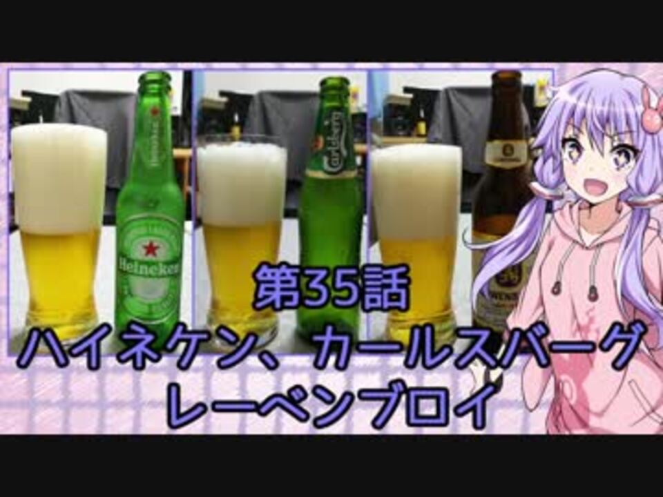 第35話はヨーロッパの大手ピルスナー、ハイネケン、カールスバーグ、レーベンブロイの3本です。<br /><br />日比谷のベルギービールウィークエンド行ってきました。<br />飲んだのはセゾン1858、ブロンシュ・デ・ナミュール、トルファ60、ピンクキラー、ブーンのブラックラベルです。<br />暑かったですが、やっぱいいですね。六本木も行きたい。<br /><br />結月ゆかりさんとゆっくりに個人的に好きなビールを飲んでもらうだけのシリーズ。<br />シリーズマイリス→<a href="https://www.nicovideo.jp/mylist/59523818" target="_blank" rel="noopener">mylist/59523818</a><br /><br />第1話 白濁 →<a href="https://www.nicovideo.jp/watch/sm31588390" class="watch">sm31588390</a><br />第34話(前回)シュレンケルラ・メルツェン、ヴァイツェン →<a href="https://www.nicovideo.jp/watch/sm33511313" class="watch">sm33511313</a><br />第36話(次回)バドワイザー、ミラージェニュインドラフト、コロナ →<a href="https://www.nicovideo.jp/watch/sm33875595" class="watch">sm33875595</a>