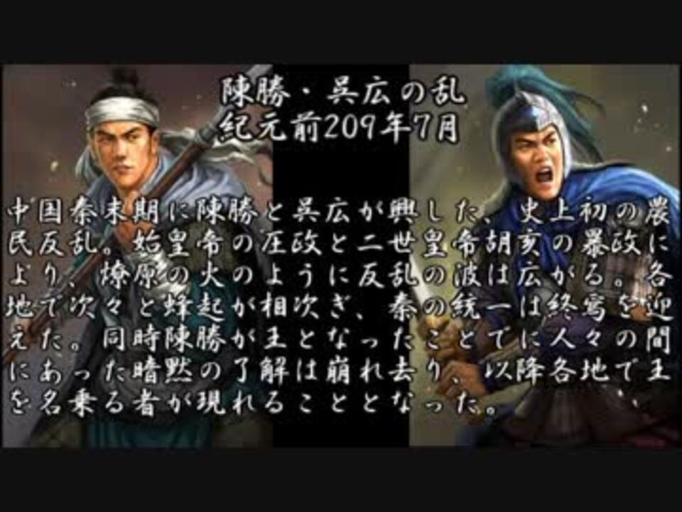 楚漢戦争を解説していきます。<br />いにしえ武将紹介から大きく外れますが、三國志シリーズの立ち絵を使うので、 タイトルとタグには三國志を含みます。<br />劇中の物事の経緯や登場人物の性格など、かなり自分なりの私見を含みますのでご注意ください。<br /><br />長期シリーズとなることが予想されるので、今回よりマイリストを別のものに分けていきます。<br /><br />楚漢戦争<a href="https://www.nicovideo.jp/mylist/63092896" target="_blank" rel="noopener">mylist/63092896</a><br /><br />いにしえ武将紹介<a href="https://www.nicovideo.jp/mylist/61740403" target="_blank" rel="noopener">mylist/61740403</a><br /><br /><a href="https://www.nicovideo.jp/watch/sm33710477" class="watch">sm33710477</a>←前 次→<a href="https://www.nicovideo.jp/watch/sm33746129" class="watch">sm33746129</a><br />