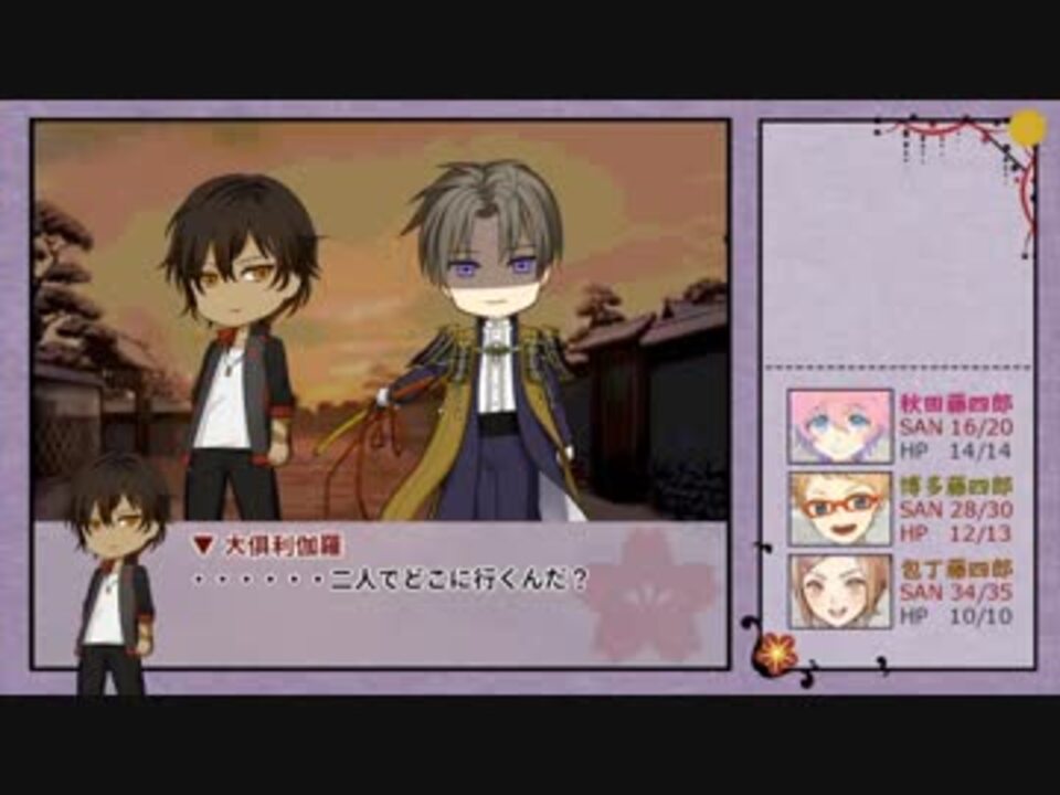 視聴は1話(<a href="https://www.nicovideo.jp/watch/sm30227486" class="watch">sm30227486</a>)からお願いします<br>第37話(<a href="https://www.nicovideo.jp/watch/sm33590430" class="watch">sm33590430</a>)→ 第38話(ココ)→ 第39話(<a href="https://www.nicovideo.jp/watch/sm33919146" class="watch">sm33919146</a>)<br>自作TRPG用マイリスト → <a href="https://www.nicovideo.jp/mylist/57764551" target="_blank" rel="noopener">mylist/57764551</a><br>人妻本編のみ → <a href="https://www.nicovideo.jp/mylist/59056281" target="_blank" rel="noopener">mylist/59056281</a><br><br>【本編の右枠に書き忘れてたので追記 】<br>・ HP2なのに気絶判定の判定が自動気絶じゃなくてCON判定なのは薬研の慈悲です<br>・ あと以前こそっと右枠に書きましたが、この卓はラストバトル以外はHP0になっても<br>メンバーの誰か1人でも生き残っていれば戦闘終了後にHP1で復活します<br>(※途中で秋田が死亡してストーリー破綻するのを防ぐための処理)<br><font color="#980000" size="4"><b>長谷部の不定の狂気は時間経過で回復なので<font color="#0000ff"><u>40話</u></font>頃には<font color="#0000ff"><u>治ります</u></font></b></font><br><br>todogonさん、catquestさん、石見国白黒猫審神者さん、さくまめさん、チキンさん、 _L_ さん<br>ニッカさん、翡翠さん、あひる審神者さん、エアーさん、夏 絲恋さん、鐘楼さん、こばるとさん<br>大和国審神者さん、fujiwara-さん、れんにゅさん、つゆはらいさん、やましろのさにわさん<br>備後国審神者さん、はにわさん、こりどらすさん、華依さん、美濃国ニャンコさん、ミツキさん<br>マイペースなさにわさん、駒鳥さん、華月さん、大俱利伽羅推しの女神さん、なんかのさにわさん<br>風鈴さん,さにわとりさん、審神者さん、ウェイブさん、備前国審神者さん、COOLな鶴丸さん<br>相模国審神者さん、半ちゃんさん、備中国審神者さん、しろくろねこさん、どっかの審神者さん<br>かたつむり審神者さん、ヨクさん、tomatoさん、蜜柑さん、miyukaさん、オーラさん、YUZUNOさん<br>やきいもさん、啄木鳥さん、美濃国審神者さん、キサrushさん、チャコさん、ワタワタさん<br>越中国人妻審神者さん、某審神者さんから広告頂きました<br>