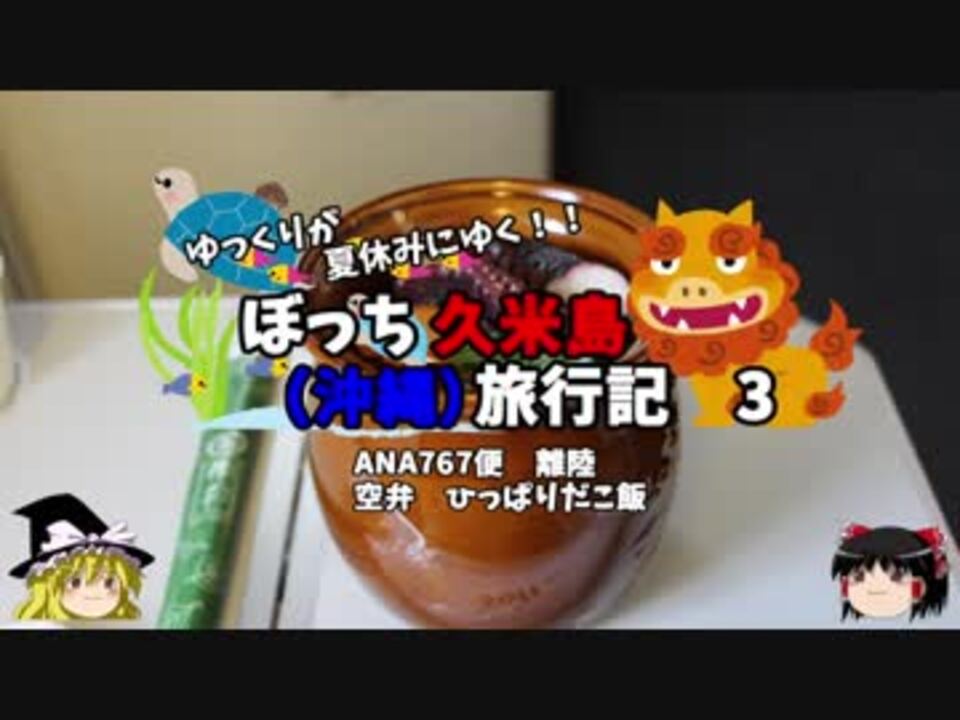 <font color="#ff0000" size="4"><u>※Youtubeで1話分、先行配信中 </u></font><br /><font color="#0000ff" size="4"> <a href="http://www.youtube.com/c/なめこのぼっち旅" target="_blank" rel="noopener nofollow">http://www.youtube.com/c/なめこのぼっち旅</a></font> <br /><br /><b> </b>さて、沖縄に向けて飛び立ちましょう!<br />機内では優雅に空弁!<br />って言っても駅弁ですが、めちゃ美味いんじゃ~!!<br /><br />第一話→<a href="https://www.nicovideo.jp/watch/sm33714205" class="watch">sm33714205</a><br /><br />1日目・・・伊丹→那覇編<font color="#ff0000">←今ココ</font><br /> 2日目・・・久米島編<br /> 3日目・・・はての浜編<br /> 4日目・・・帰路編<br /><br /><font color="#ff0000">コミュニティー→co2910020</font><br /> twitter→<a href="https://twitter.com/ryontan" target="_blank" rel="noopener nofollow">https://twitter.com/ryontan</a><br /><br /><a href="https://www.nicovideo.jp/watch/sm33728458" class="watch">sm33728458</a>←前回 <font color="#ff0000">次回 4話→<a href="https://www.nicovideo.jp/watch/sm33769725" class="watch">sm33769725</a></font><br /><br />解説・雑談系→<a href="https://www.nicovideo.jp/mylist/63171869" target="_blank" rel="noopener">mylist/63171869</a><br />今作 久米島(沖縄)旅行記→<a href="https://www.nicovideo.jp/mylist/63059251" target="_blank" rel="noopener">mylist/63059251</a><br />今作 車中泊旅行記→<a href="https://www.nicovideo.jp/mylist/54706524" target="_blank" rel="noopener">mylist/54706524</a><br /><b></b>前作 イギリスタイ旅行記→<a href="https://www.nicovideo.jp/mylist/60044833" target="_blank" rel="noopener">mylist/60044833</a><br />第6弾 クルーズ旅行記→<a href="https://www.nicovideo.jp/mylist/57397685" target="_blank" rel="noopener">mylist/57397685</a><br />第5弾 ドイツ周遊記→<a href="https://www.nicovideo.jp/mylist/54938346" target="_blank" rel="noopener">mylist/54938346</a><br />第4弾 北海道旅行記→<a href="https://www.nicovideo.jp/mylist/52618057" target="_blank" rel="noopener">mylist/52618057</a><br />第3弾 アメリカ横断記→<a href="https://www.nicovideo.jp/mylist/48621785" target="_blank" rel="noopener">mylist/48621785</a><br />第2弾 イタリア周遊記→<a href="https://www.nicovideo.jp/mylist/45763559" target="_blank" rel="noopener">mylist/45763559</a><br />第1弾 NY旅行記→<a href="https://www.nicovideo.jp/mylist/44343854" target="_blank" rel="noopener">mylist/44343854</a><font color="#ff0000" size="5"><font color="#000000" size="2"><br /></font></font>
