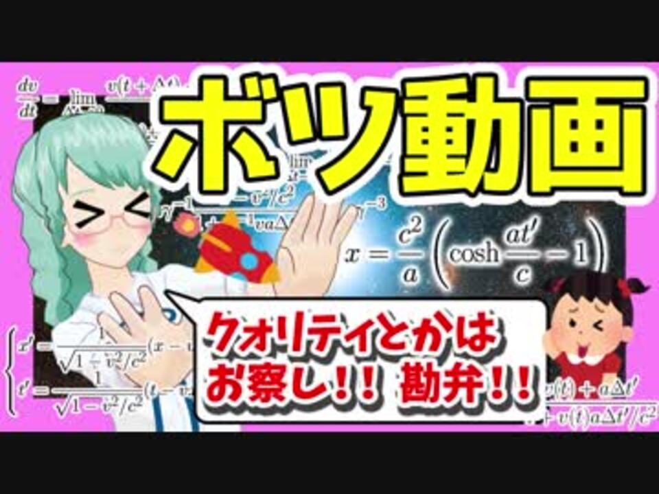 ※※※閲覧超注意!!※※※<br />高校数学Ⅲと高校物理の既修者、大1以上のみ対象動画です。今回の動画はたとえるならCERO:Zです!!<br /><br />宇宙物理たんのアストロフィジカルトーク<br />#02(β)「双曲運動のエピグラフ」<br />【浦島効果のボツシーン】<br /><br />アストロフィジカルトーク第2話 <a href="https://www.nicovideo.jp/watch/sm33757588" class="watch">sm33757588</a> では浦島効果(特殊相対性理論による時間の遅れ)をご紹介しました。20分18秒あたりで「10秒に圧縮します」で飛ばした相対論のガチ講義部分をお蔵出しします!<br /><br />つってもありもののフィルムを等倍で再生してるんじゃなくてこれ新録ですよ! ボツ動画を新録するというありえない異常事態でした……。<br /><br />※この動画は当初2018年6月30日にYouTubeで放映されていたものです。<br /><br />前回 第2話【浦島効果】 <a href="https://www.nicovideo.jp/watch/sm33757588" class="watch">sm33757588</a><br />次回 第3話【地球破壊】 <a href="https://www.nicovideo.jp/watch/sm33760269" class="watch">sm33760269</a><br /><br /><b>☆★☆★☆『宇宙物理たんbotのアストロフィジカルトーク』 <a href="https://www.nicovideo.jp/mylist/63188725" target="_blank" rel="noopener">mylist/63188725</a> ★☆★☆★</b>