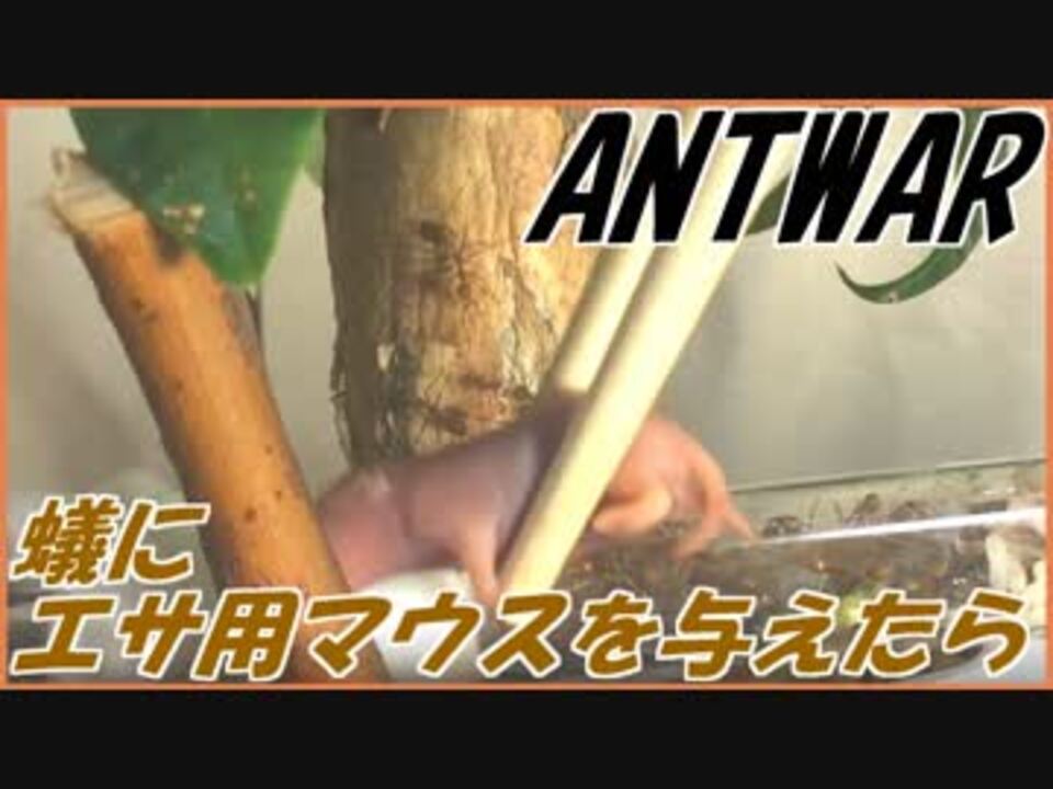<a href="https://www.nicovideo.jp/watch/sm33814025" class="watch">sm33814025</a>←もどる 次へ→ <a href="https://www.nicovideo.jp/watch/sm33840680" class="watch">sm33840680</a><br /><br />火曜・木曜・土曜の週3回更新。 <br /><br /> 蟻戦争マイリスト→<u><a href="https://www.nicovideo.jp/mylist/56298874" target="_blank" rel="noopener">mylist/56298874</a></u><br /><br /> ∧__∧<br /> (・ω・)<今回はエサ用マウスをアリに与える動画です。捕食系動画が苦手な方は閲覧にご注意下さい。<br /><br /> 蟻は高度な社会性を持つ昆虫である。<br /> ~The ANT is advanced social insect.~<br /><br /> 卵を産む役、飼育する役、兵隊役などに分かれ、1つのコミュニティを形成する。<br /> ~ANTs constitute one comunity.ANTs have the part(childbirth,bring