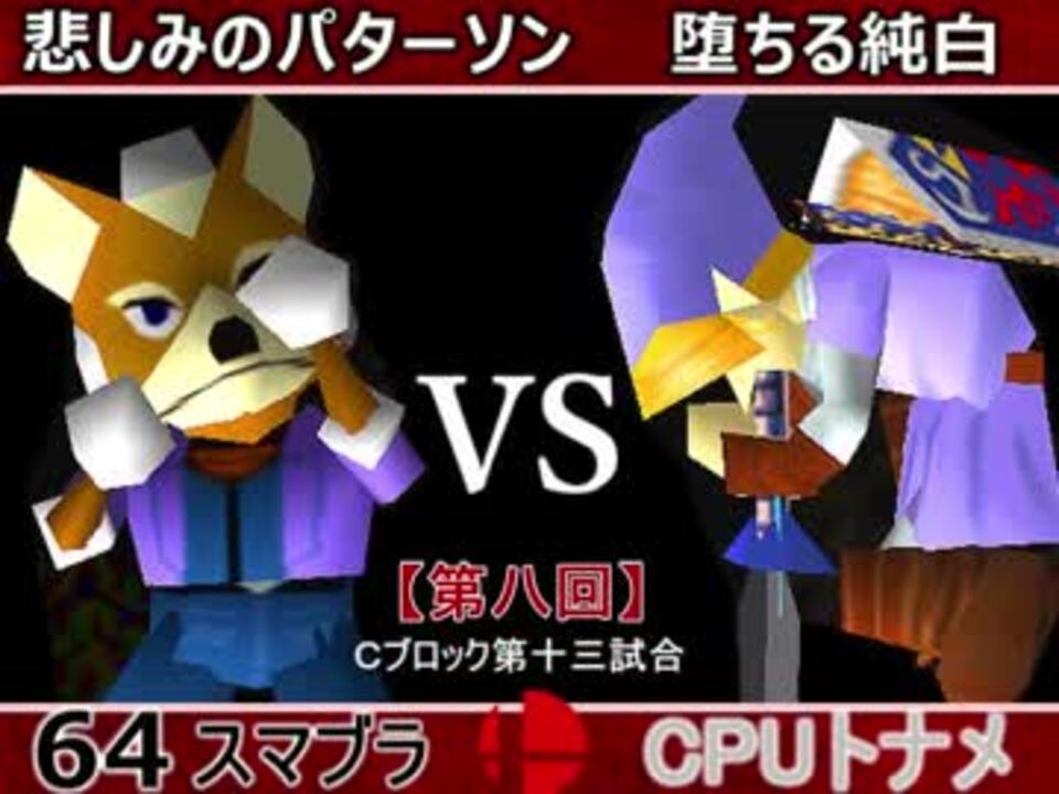 パターソン→負けたら敗退、純白→勝てば通過<br />※どちらが勝つかアンケ結果(Twitter調べ) <br />悲しみのパターソン(FO) 48% VS 堕ちる純白(LI) 52%<br /><br /><font color="#0000ff"><u>※64スマブラCPUトナメ実況のwikiができた模様</u>→</font> <a href="https://wiki3.jp/cpu_64" target="_blank" rel="noopener nofollow">https://wiki3.jp/cpu_64</a><br /><br /><b><font size="5"><font color="#ff0000">次→</font></font></b>【<a href="https://www.nicovideo.jp/watch/sm33853175" class="watch">sm33853175</a>】※毎日投稿 <font color="#ff0000"><u>※これからの投稿は1日1投稿となります</u></font><font color="#ff0000"><u><br /></u></font><br />前【<a href="https://www.nicovideo.jp/watch/sm33838732" class="watch">sm33838732</a>】 Cブロック第一試合【<a href="https://www.nicovideo.jp/watch/sm33474964" class="watch">sm33474964</a>】 <br />Aブロック第一試合【<a href="https://www.nicovideo.jp/watch/sm33462799" class="watch">sm33462799</a>】 <br />出場選手紹介【<a href="https://www.nicovideo.jp/watch/sm33435891" class="watch">sm33435891</a>】<br /> <br />第八回マイリスト【<a href="https://www.nicovideo.jp/mylist/62486112" target="_blank" rel="noopener">mylist/62486112</a>】 <br />64スマブラCPUトナメ実況part1まとめ【<a href="https://www.nicovideo.jp/mylist/60846861" target="_blank" rel="noopener">mylist/60846861</a>】<br />その他シリーズ【<a href="https://www.nicovideo.jp/mylist/12965027" target="_blank" rel="noopener">mylist/12965027</a>】<br /><br /><b><font color="#00bfff">Twitter</font></b>【<a href="https://twitter.com/niconicopppppp】" target="_blank" rel="noopener nofollow">https://twitter.com/niconicopppppp】</a><br /><b><font color="#ff4500">チャンネル</font></b>【<a href="https://ch.nicovideo.jp/p-desu" target="_blank" rel="noopener">ch.nicovideo.jp/p-desu</a>】