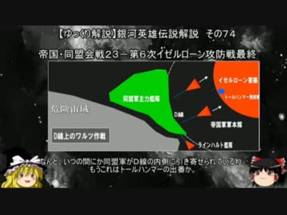 宇宙暦794年/帝国暦485年12月1日、同盟軍イゼルローン要塞攻略が始まる。<br />同盟軍はホーランド少将発案による「D線上のワルツ」作戦により、イゼルローン要塞の外壁の一部を破るなど<br />有利に戦いを進める。しかし、何処かに潜んでいたラインハルト艦隊がホーランド艦隊に攻めかかる。<br />規模は同程度と思われる両艦隊だが、ホーランド艦隊はほとんどがミサイル艦で通常の構成と異なり、<br />ホーランドはラインハルト艦隊に対抗できないと悟り、本隊と合流すべく退却する。<br />ラインハルトはさらに同盟軍本隊に攻撃をかける。数的に約15倍の敵に攻撃をかけたわけだが、<br />ラインハルトにはイゼルローン回廊固有の地形を利用した策があった。<br />その一方で同盟のローゼンリッター連隊は、強襲揚陸艦を用いて帝国艦を乗っ取った後、<br />帝国艦から通信で「出てこい、出てこいリューネブルクぅー。出てくればあの世へ直行便」と流し続けた。<br />これは明らかにリューネブルクに対する挑戦である。この話がミュッケンベルガー元帥に伝わり、リューネブルクに対して決着を付けるように命令する。<br /><br />第01話 <a href="https://www.nicovideo.jp/watch/sm33175734" class="watch">sm33175734</a><br />第75話 <a href="https://www.nicovideo.jp/watch/sm33889248" class="watch">sm33889248</a><br />第73話 <a href="https://www.nicovideo.jp/watch/sm33864283" class="watch">sm33864283</a><br /><br />マイリスト <a href="https://www.nicovideo.jp/mylist/12818453" target="_blank" rel="noopener">mylist/12818453</a><br />コミュニティ co3805222<br /><br />