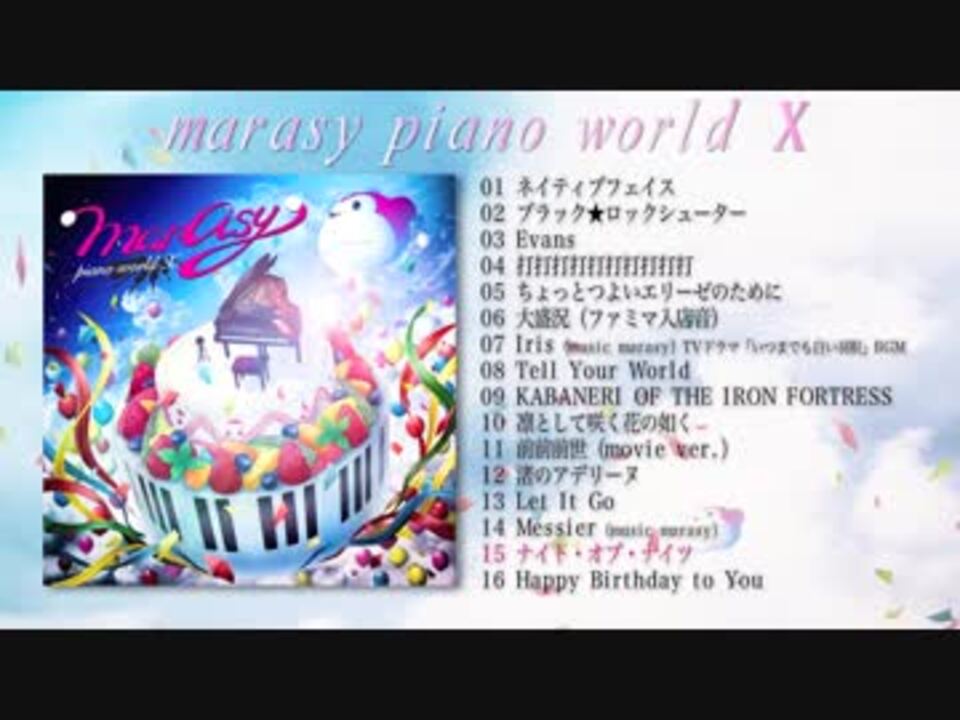 まらしぃです。<br /><br />10/24に10周年記念のアルバム「marasy piano world X」をリリースさせていただきます。<br />好きで続けてきた動画投稿を振り返るような特別なアルバムになりました。<br />前からずっと見てくださった方も、最近知ったよという方もぜひ聴いてもらいたいです。<br />どうぞよろしくお願いします^ω^<br /><a href="http://www.subcul-rise.jp/marasy/pianoworld10th/" target="_blank" rel="noopener nofollow">http://www.subcul-rise.jp/marasy/pianoworld10th/</a><br /><br />album art movie:七星さん @nnhsykr<br />------------------------------------------<br />Amazon(初回盤CD+DVD 2019カレンダー付)<br /><a href="https://www.amazon.co.jp/dp/B07GCJYM27" target="_blank" rel="noopener nofollow">https://www.amazon.co.jp/dp/B07GCJYM27</a><br /><br />ライブツアーの追加公演もやらせていただきます<br /><a href="http://www.subcul-rise.jp/marasy/live2018/" target="_blank" rel="noopener nofollow">http://www.subcul-rise.jp/marasy/live2018/</a>